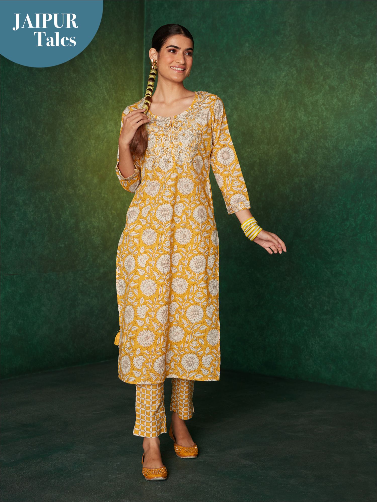 Likha Yellow Ikat Printed Straight Co-ord Set LIKSKD184 (Set of 2) - S