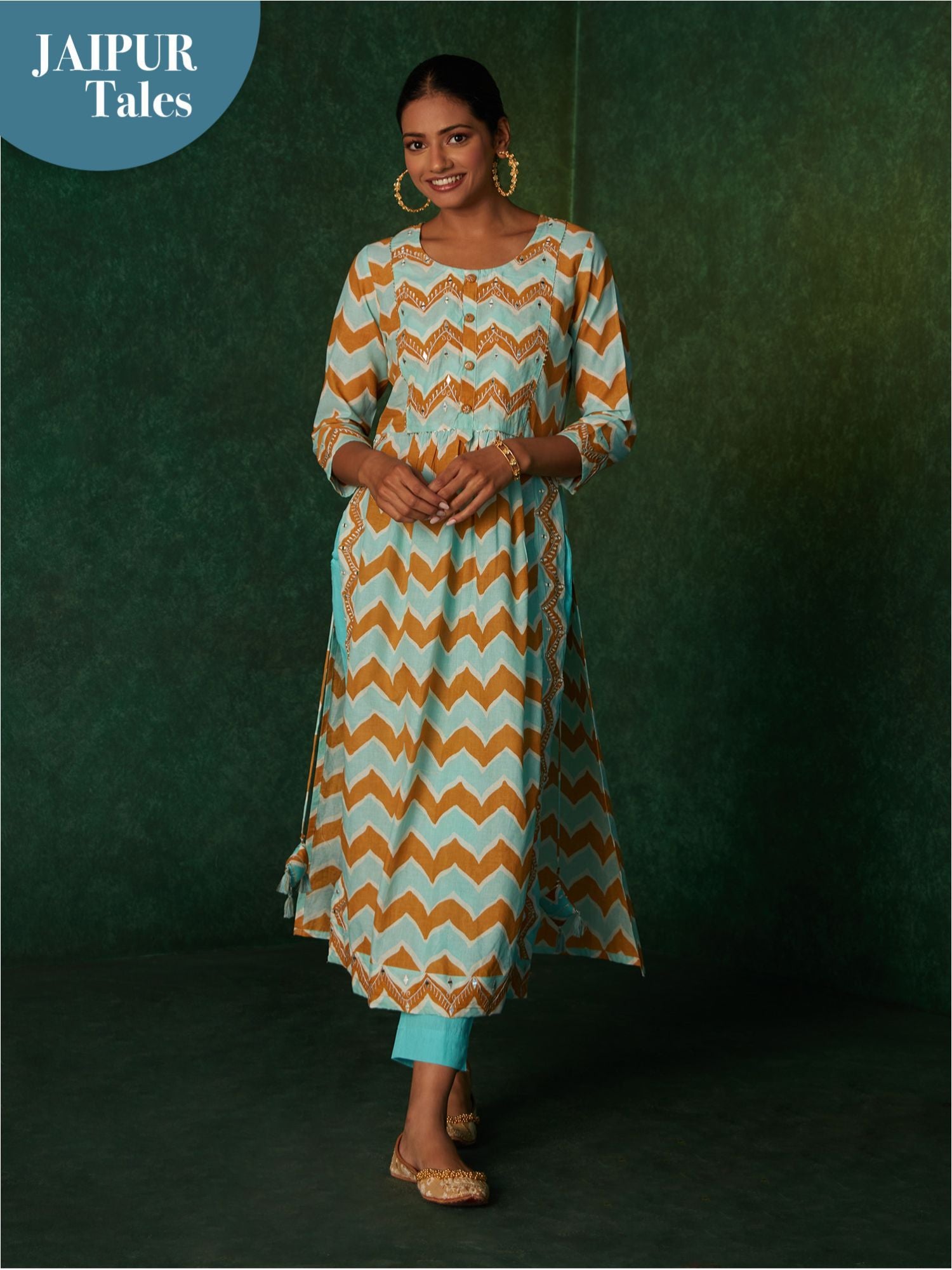 Likha Blue Jaipuri Printed Naira Cut Co-ord Set LIKSKD140 (Set of 2)