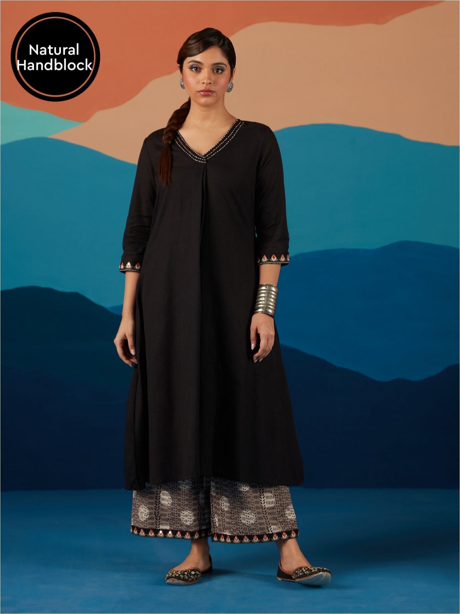 Likha Black Indigo Saga Hand block print Co-ord Set With Scarf LIKSKD196 (Set of 4) - L