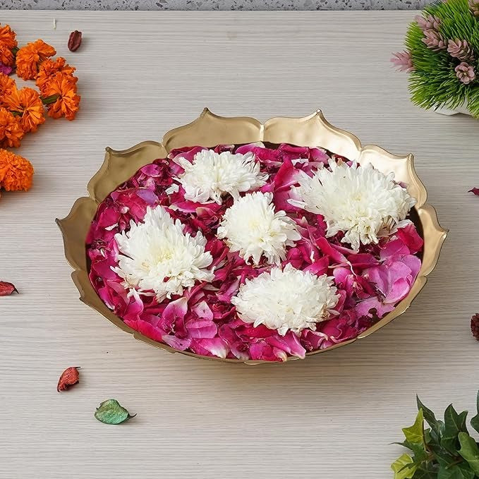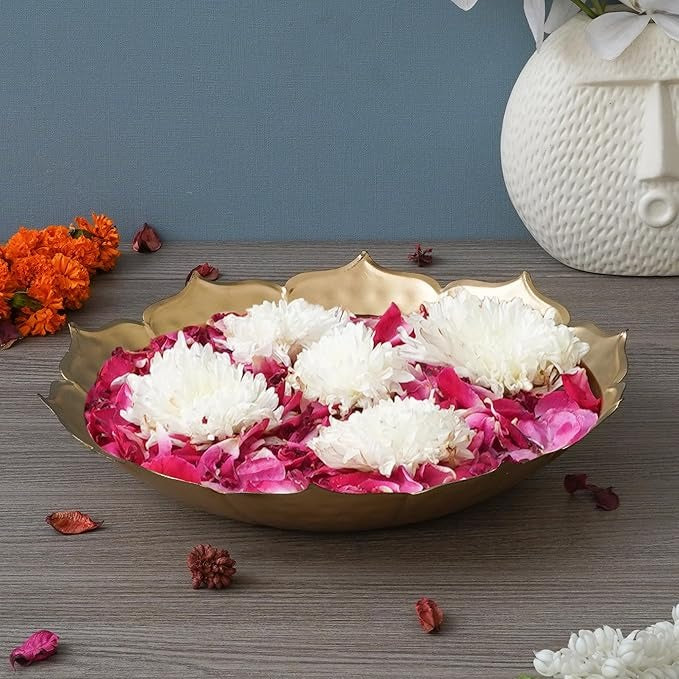 • Elevate your home, office home decor, temple, or public area with the Golden Metal Handcrafted Lotus Flower Shape Designer Urli. A versatile and re-usable home decor piece that adds charm to every corner.