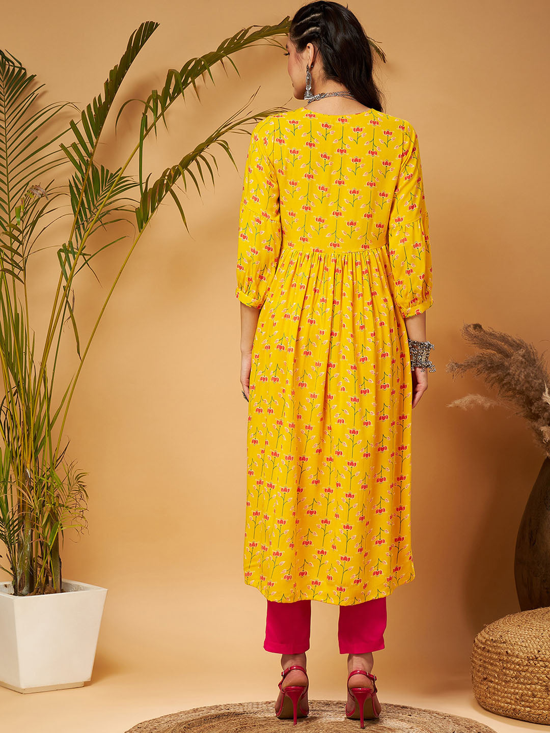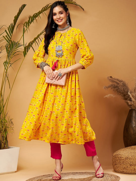 Shae by Sassafras Yellow Ethnic Motifs Printed Tie-Up Neck A-Line Kurta
