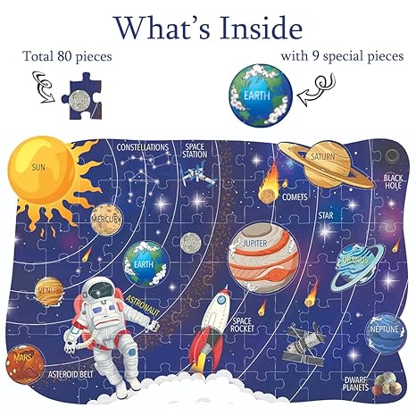 • Space-Themed Puzzle Adventure: Explore the cosmos with an 80-piece puzzle featuring vibrant illustrations of planets, stars, and spacecraft.