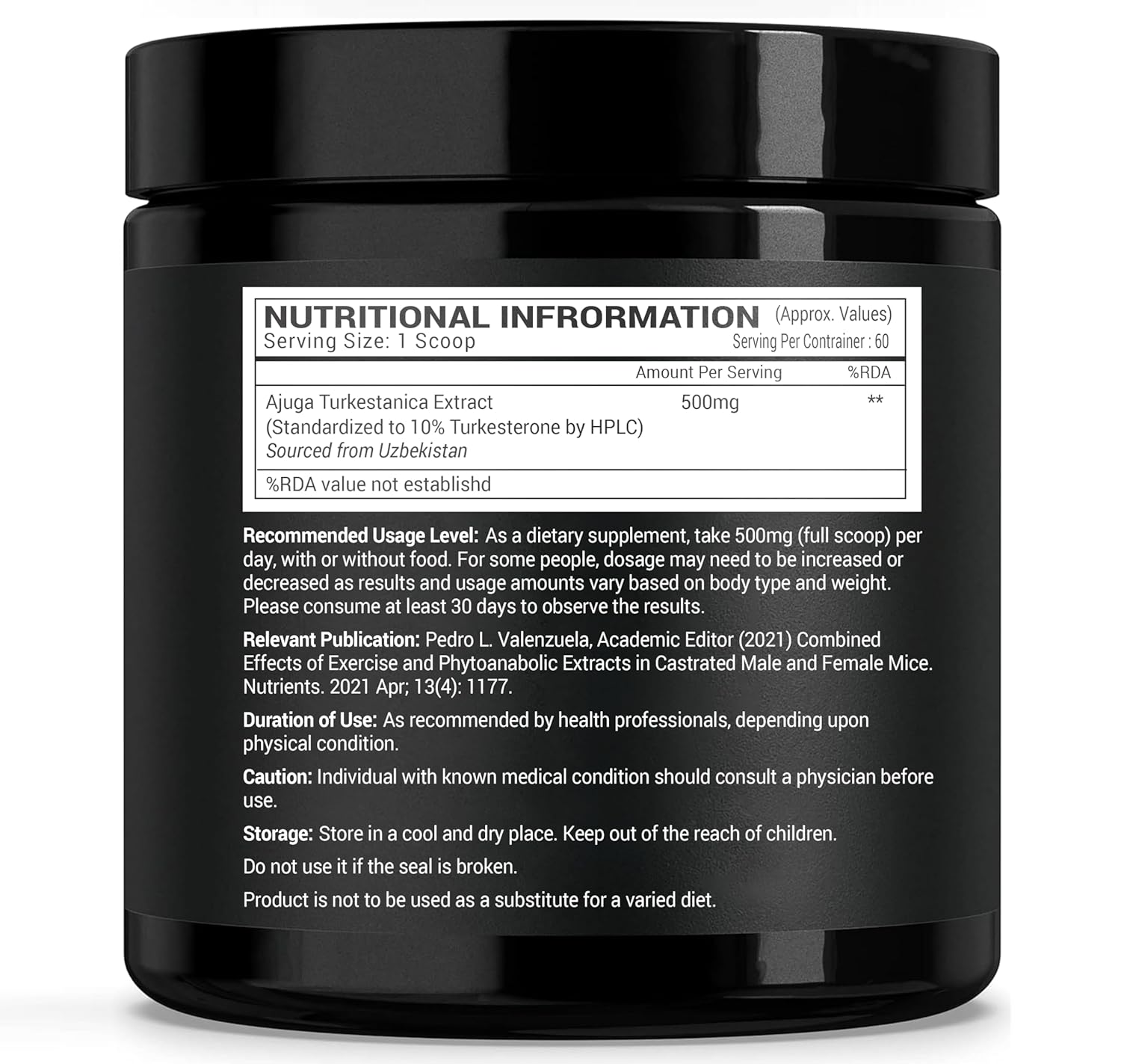 - Dosage : Each bottle of Turkesterone contains two months servings of 500 mg of Ajuga Turkesranica, dosage can be increased or decreased depending on the