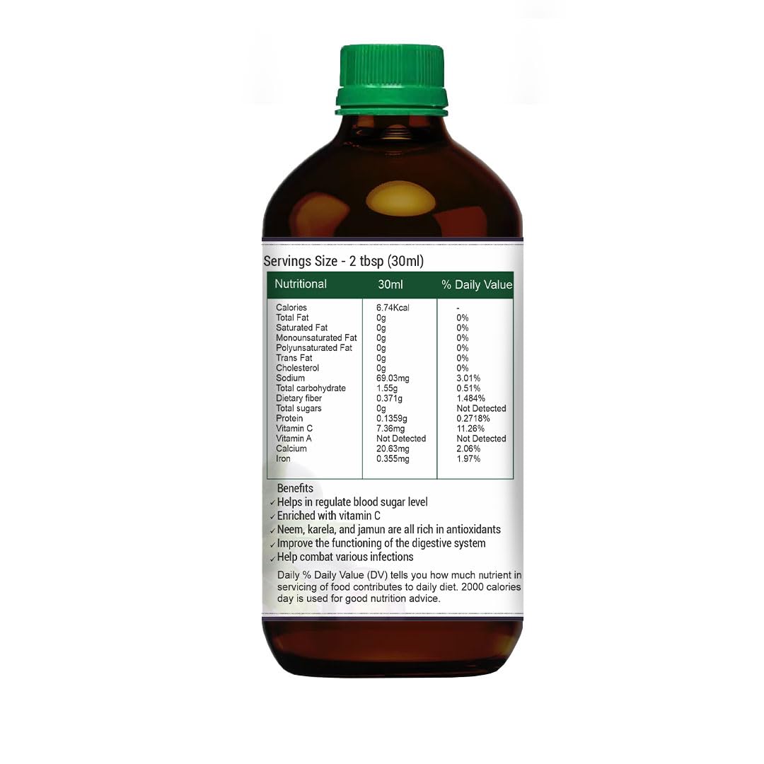 • This natural juice combines neem, karela (bitter gourd), and jamun in a time-tested herbal formulation. Made with organic ingredients and no added sugar, it offers a clean, traditional option for your daily wellness routine. Carefully bottled in a 500ml pack for everyday convenience.
