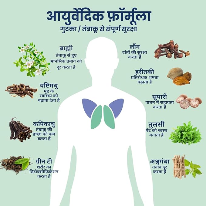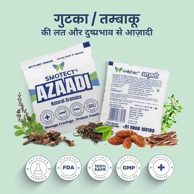• Introduction: Smotect Azaadi is a nicotine-free herbal solution made with 10 Ayurvedic herbs like Brahmi, Ashwagandha, and Tulsi to help you quit chewing tobacco and overcome gutkha addiction naturally. It helps reduce cravings, detoxify the body, and repair damage caused by tobacco use, combining Ayurvedic wisdom with scientific validation for a healthier, tobacco-free lifestyle.