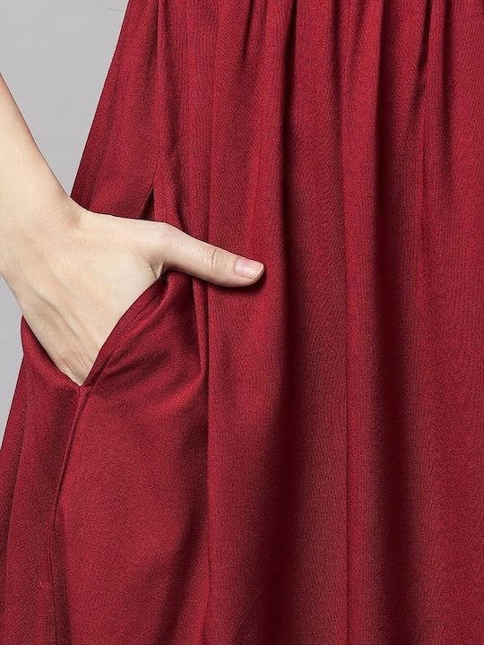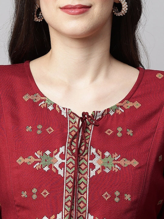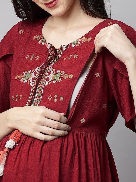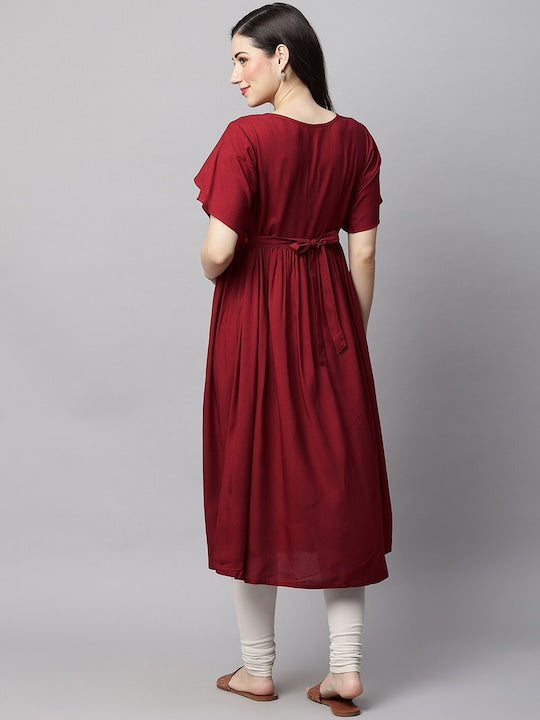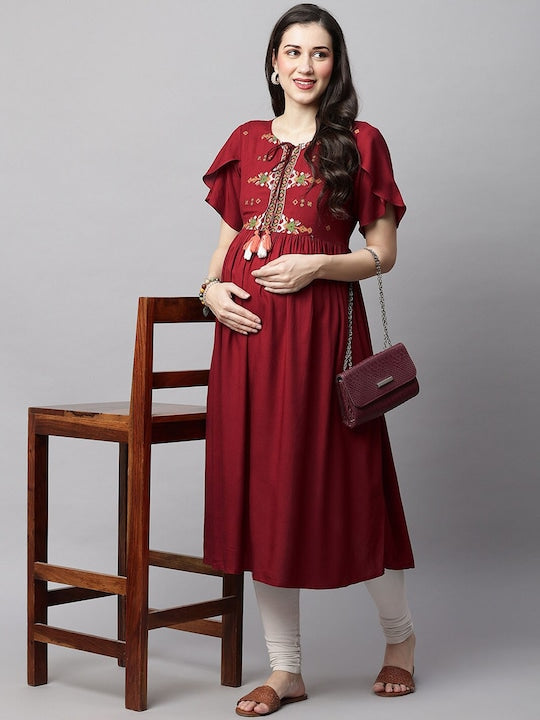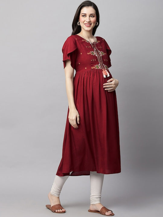 MomToBe Floral Yoke Design Flared Sleeves Thread Work Maternity Kurta