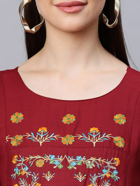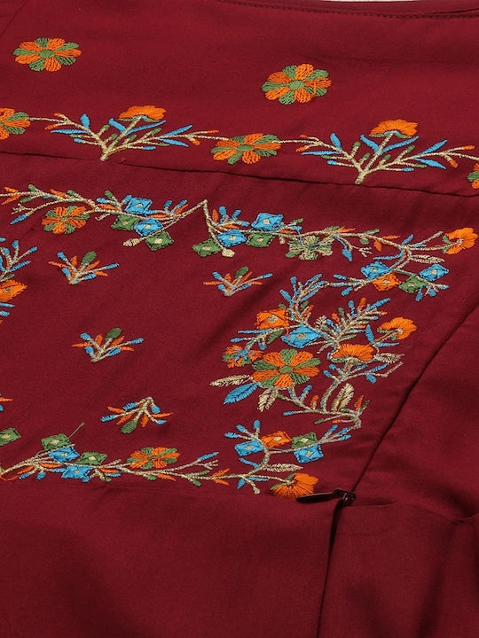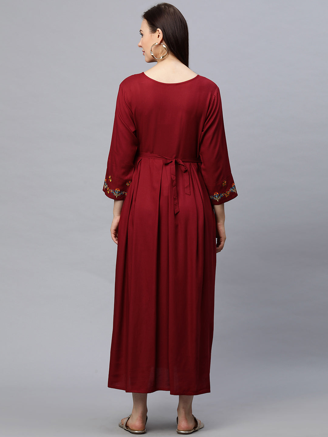• Maroon solid woven maxi dress, has a round neck, three-quarter sleeves, and flared hem