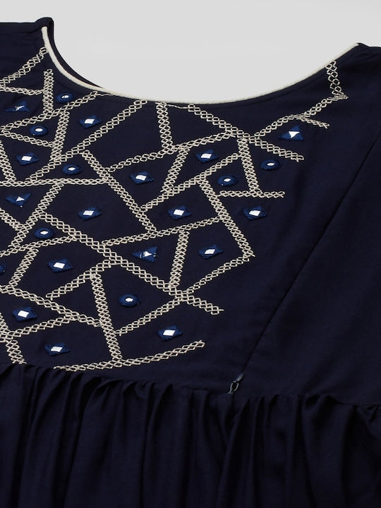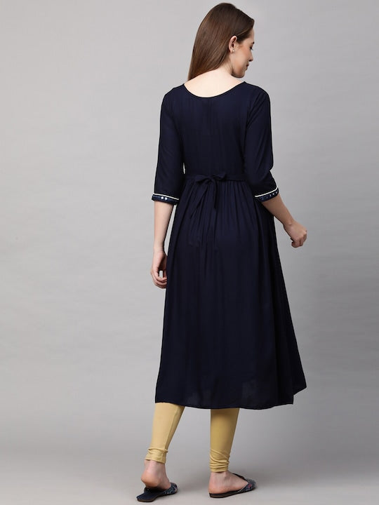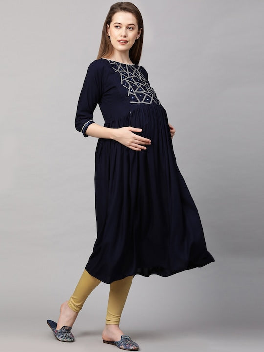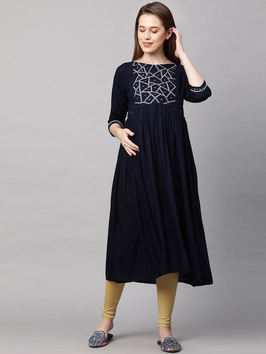 MomToBe Women Navy Blue Yoke Design Mirror Work Maternity Nursing Anarkali Kurta