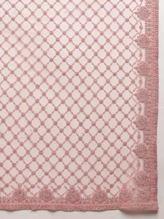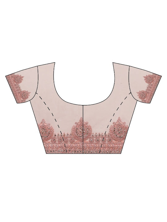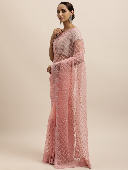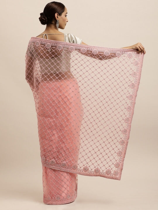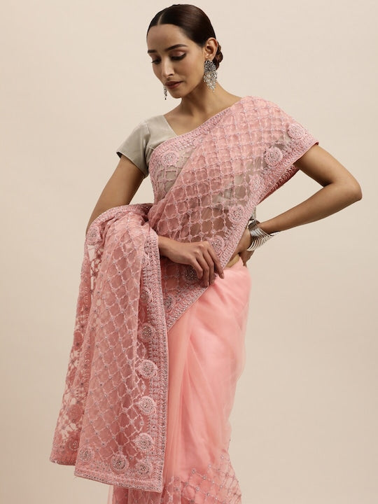 Kasee Peach-Coloured Floral Embroidered Net Saree