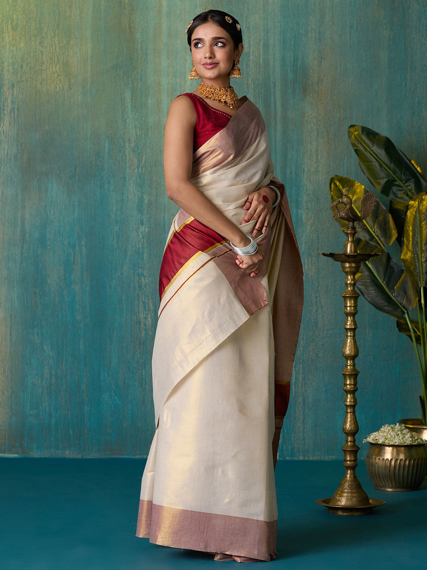 Likha Off-White Maroon Tyohar Kasavu Cotton Zari Saree with Running Blouse LIKSAR124 (Free Size)