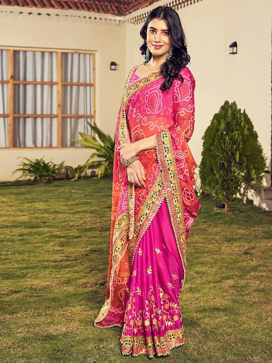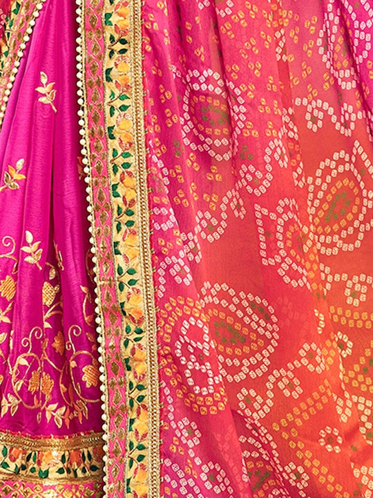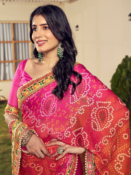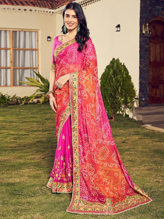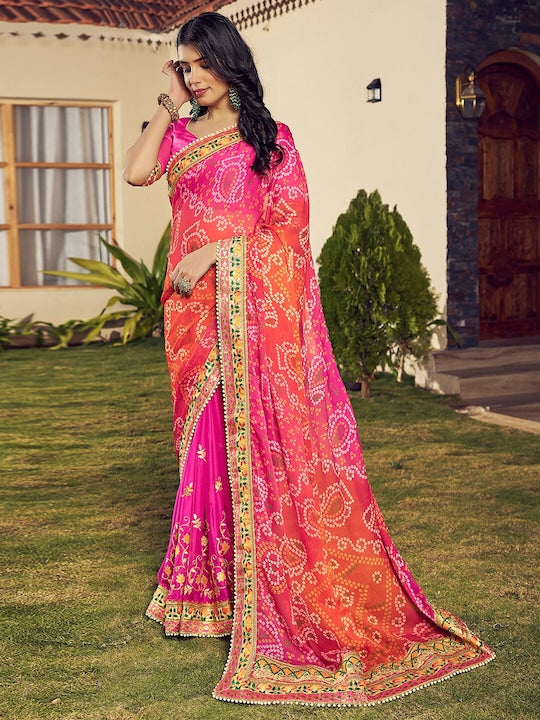 • Orange and pink bandhani saree with blouse
