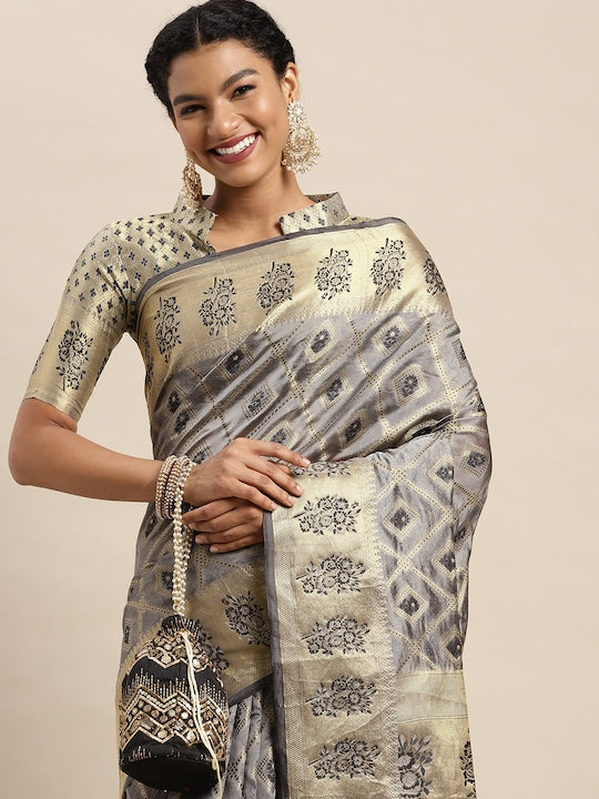 Satrani Women Grey Geometric Woven Design Organza Kanjeevaram Saree