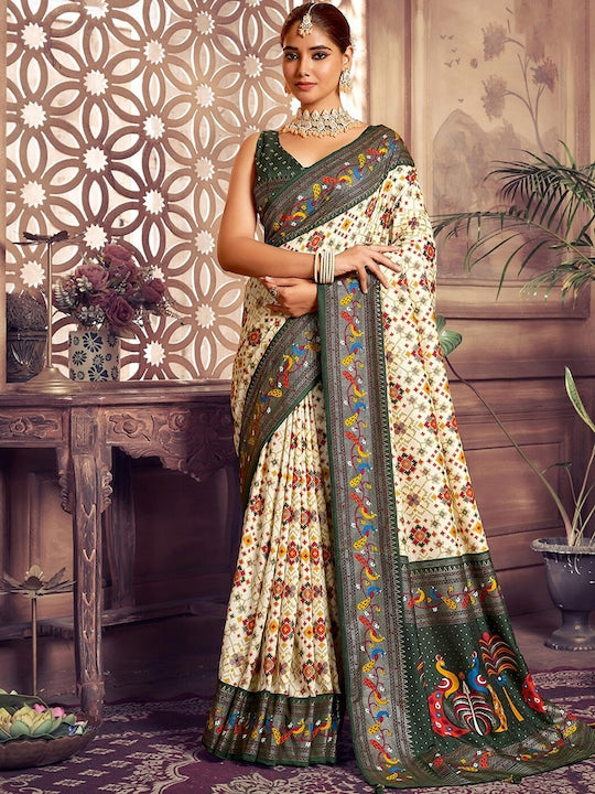 Satrani Cream Coloured Floral Printed Maheshwari Satin Saree