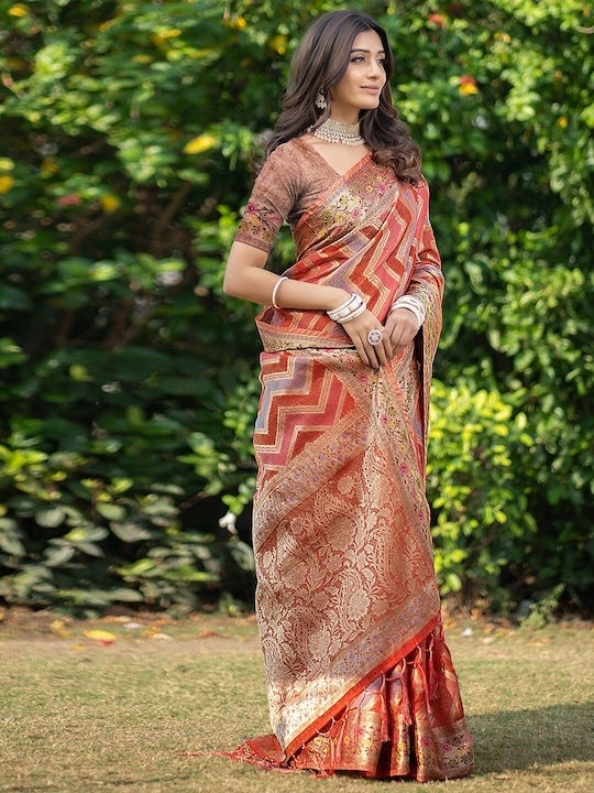 Satrani Ethnic Motifs Woven Design Zari Banarasi Saree