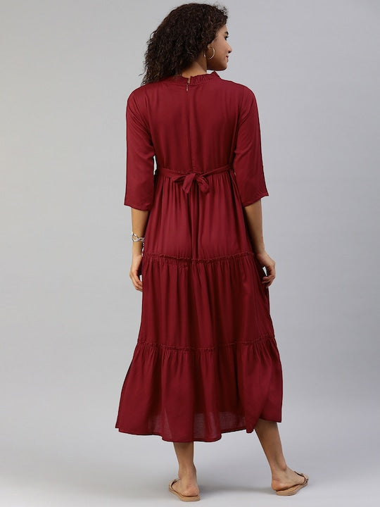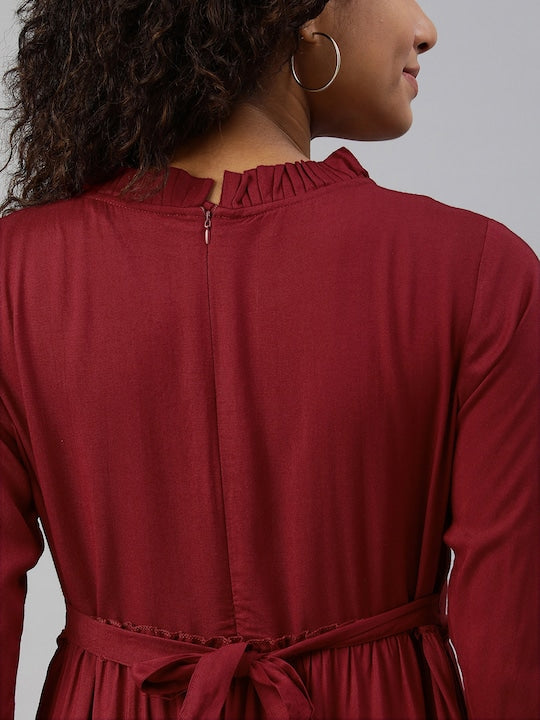 - Maroon solid maxi dress, has a round neck, concealed zip closure, and flared hem