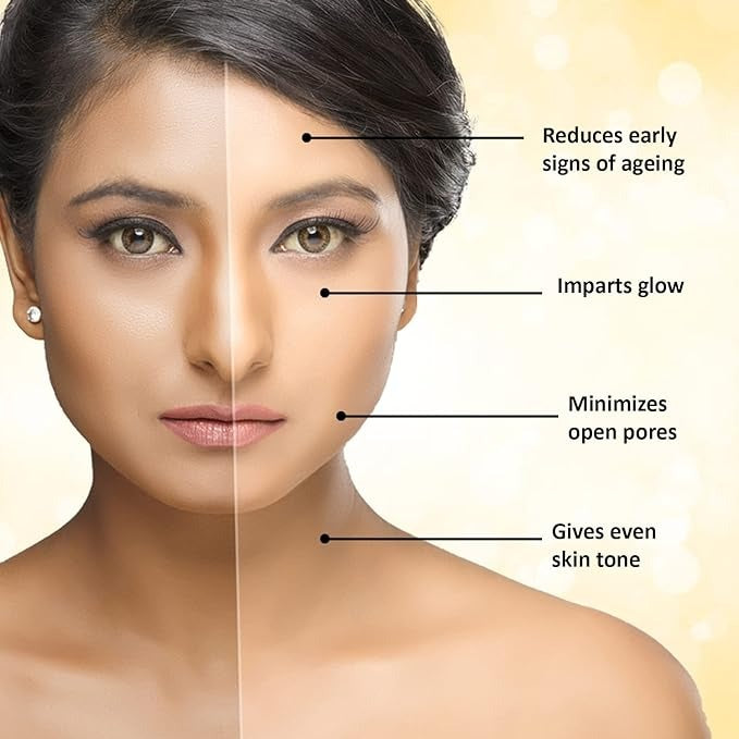 - Key Ingredients: 24k Gold dust (1-2 %), Hyaluronic acid, Veg glycerin, Aloe vera extract and Witch hazel extract.