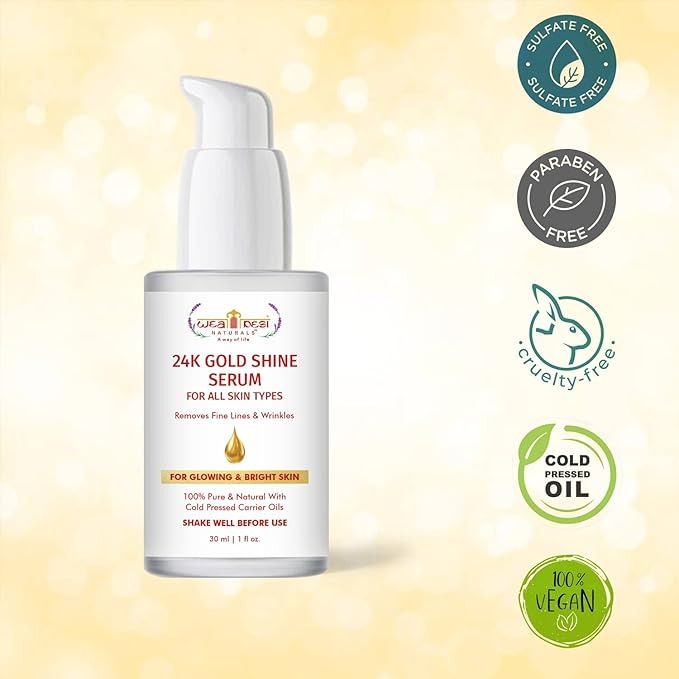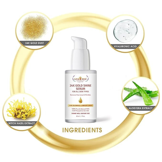 - 24K Gold Shine Serum, 24k gold sreum for glowing skin, gold serum for face, 24k gold serum, 24k gold sreum for glowing skin anti aging: Our gold face serum contains 100% pure and natural ingredients. Gold particles fades dark spots pigmentation and boosts skin radiance.