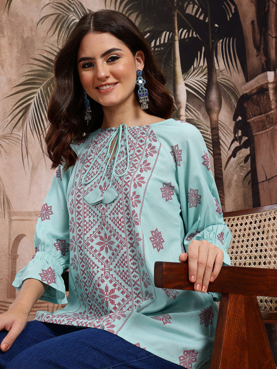 Sangria Print Tie-Up Neck Bell Sleeve Ethnic Top