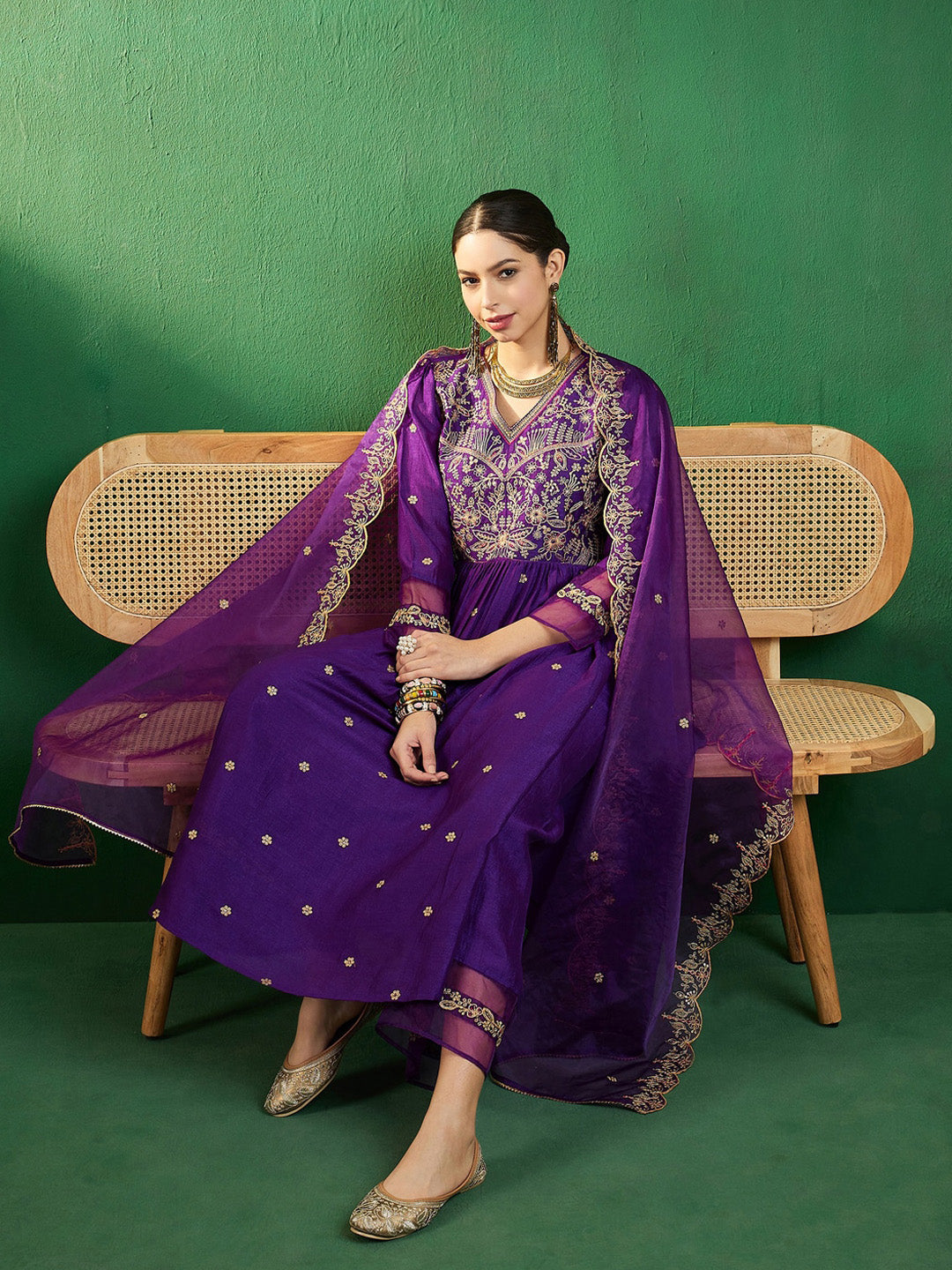 Sangria Purple Ethnic Motifs Embroidered A-Line Kurta With Palazzo & Dupatta