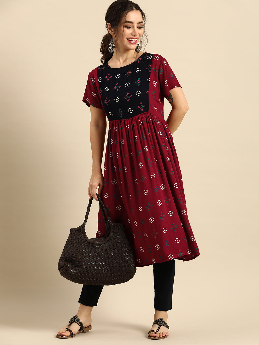 Sangria Women Maroon & Black Geometric Printed Crepe Anarkali Kurta