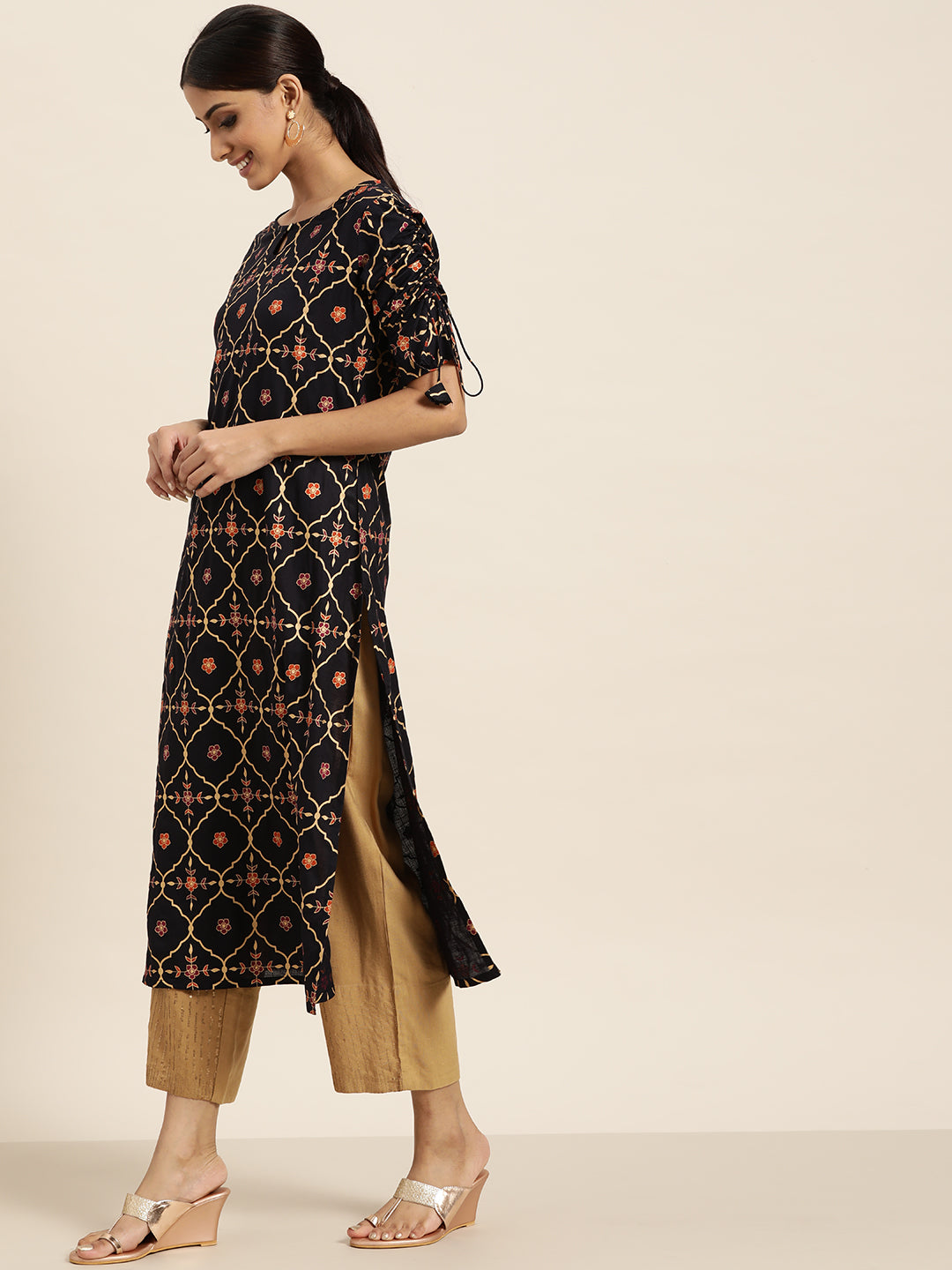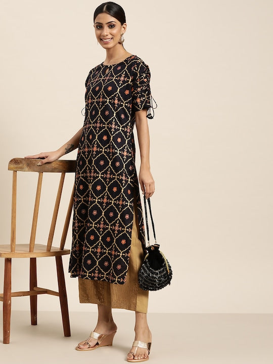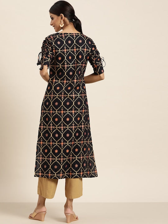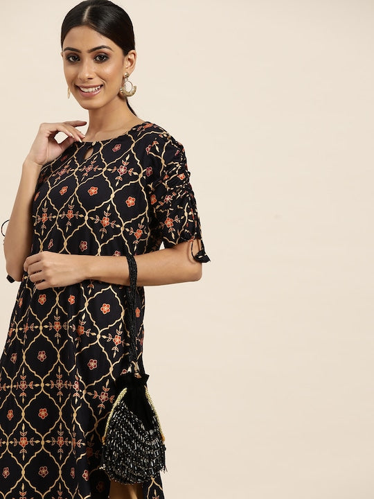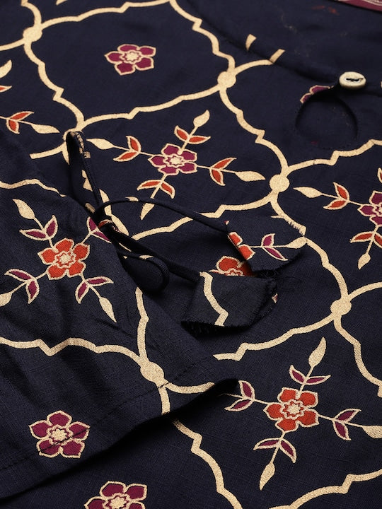 Sangria Women Navy Blue & Golden Ethnic Motifs Printed Keyhole Neck Kurta