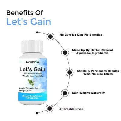 - Let's Gain is a natural ayurvedic Indian formula to gain weight naturally without any side effects, It additionally increases the mass in the body and provides strength to the bones which results in gaining weight.