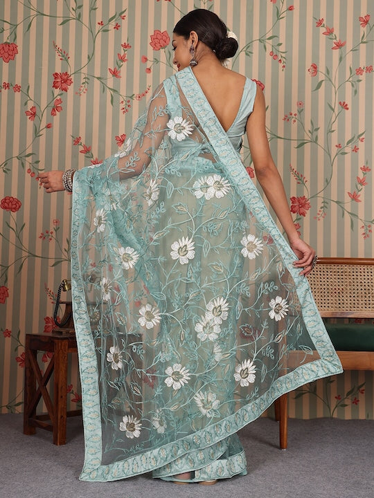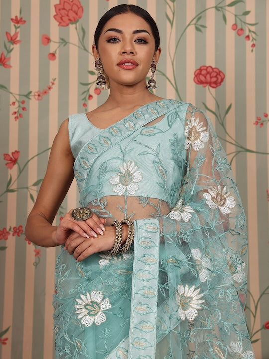 - Turquoise blue and white saree