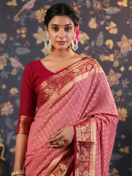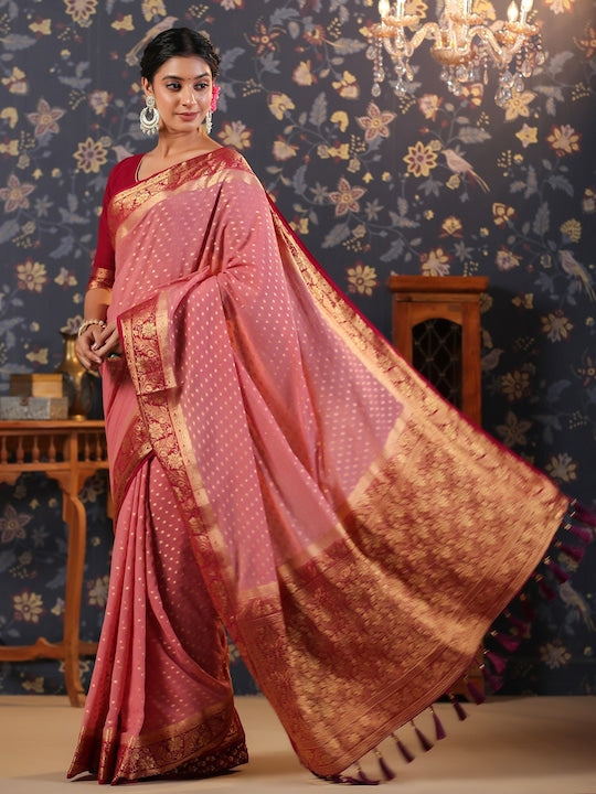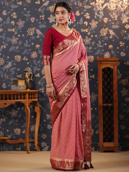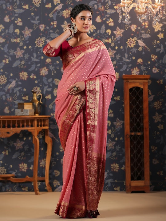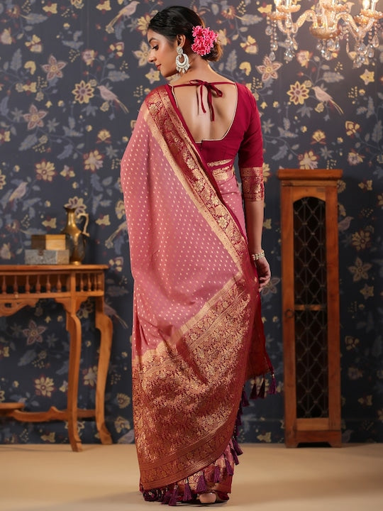 - Pink, maroon & gold toned Banarasi saree