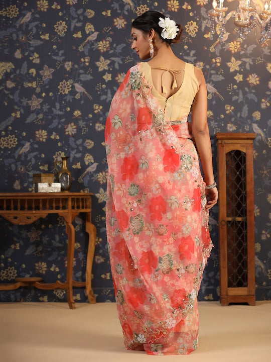 House of Pataudi Mauve & White Floral-Printed Beads & Stones Organza Saree