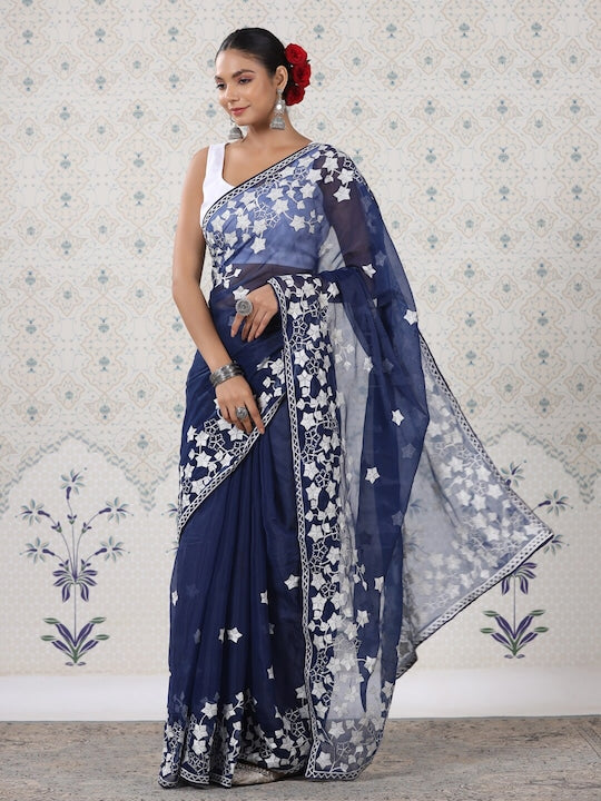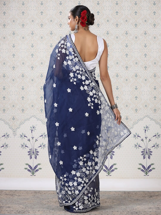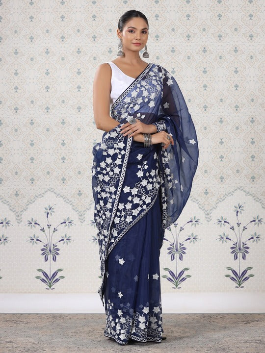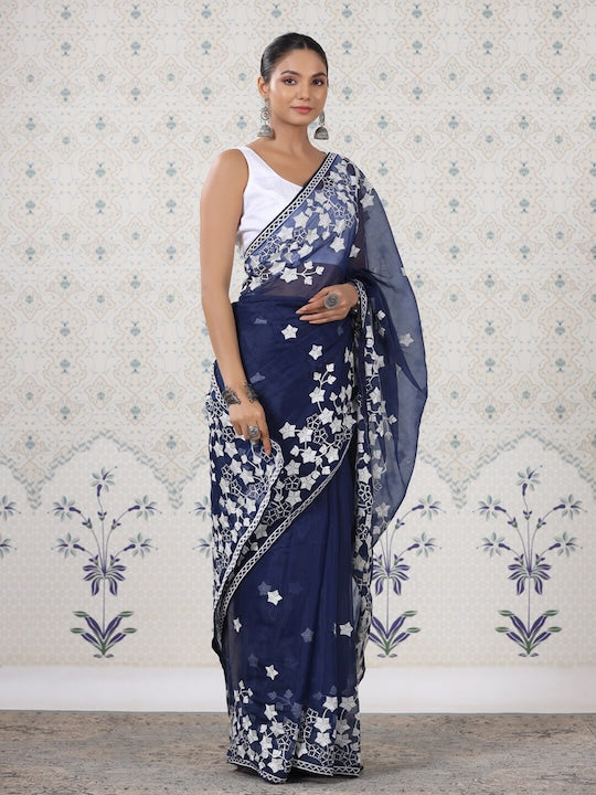 House of Pataudi Navy Blue Floral Organza Saree