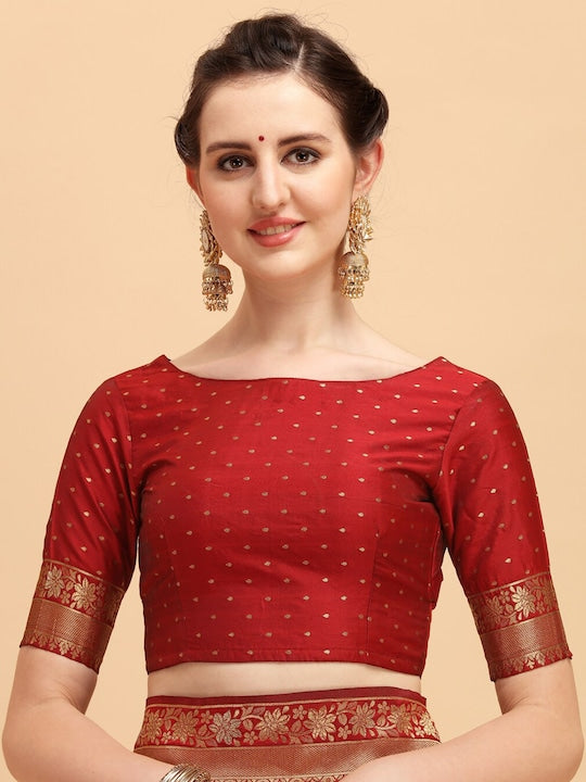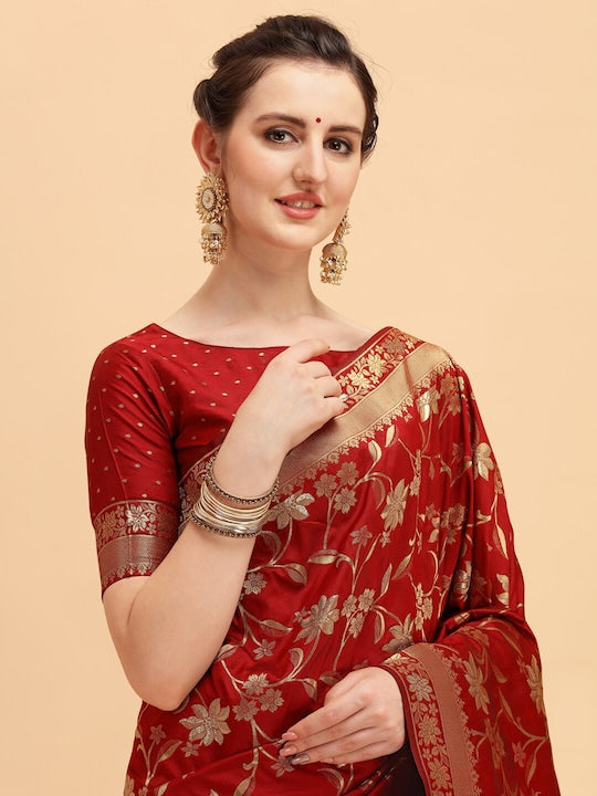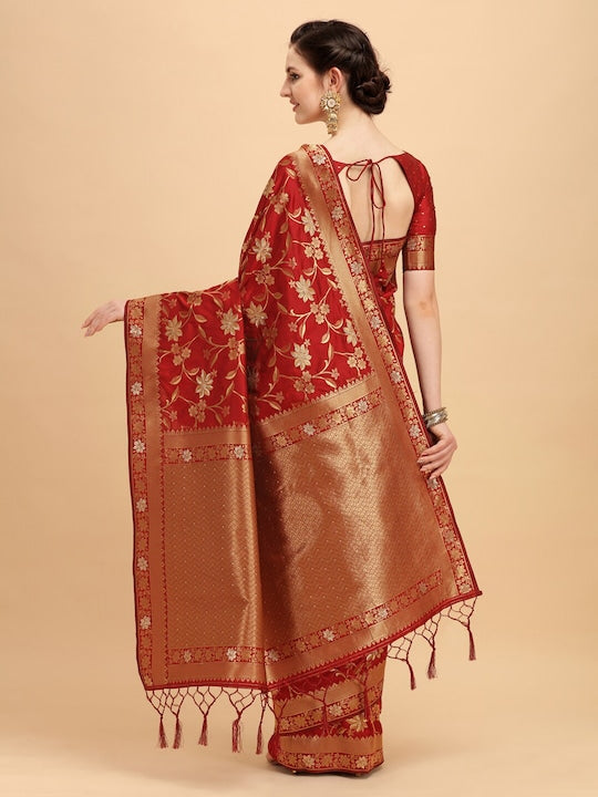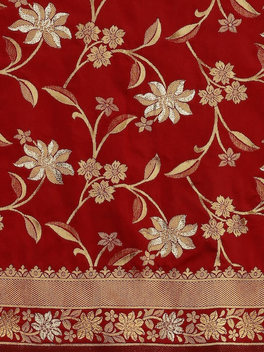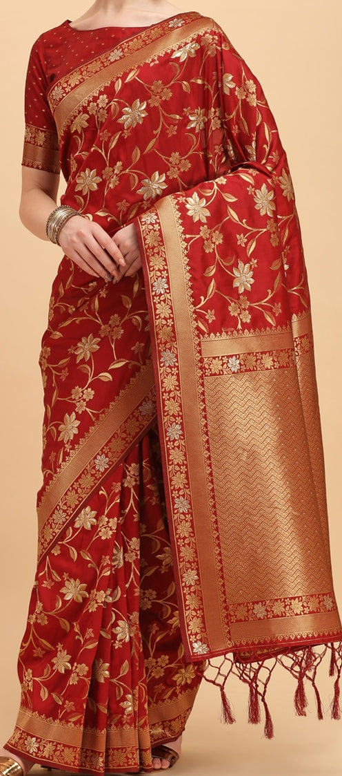 - Pure Red Traditional Benarasi Saree with Floral Dual Gold Zari Woven Silk Blend Saree that enhances your beauty and makes you perfect for Festive Parties and functions.