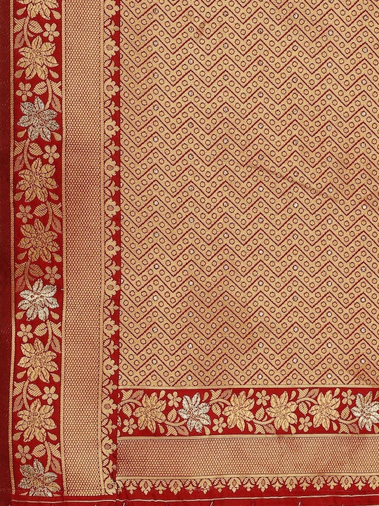 House of Pataudi Red & Golden Floral Zari Silk Blend Saree