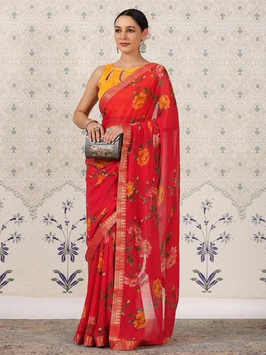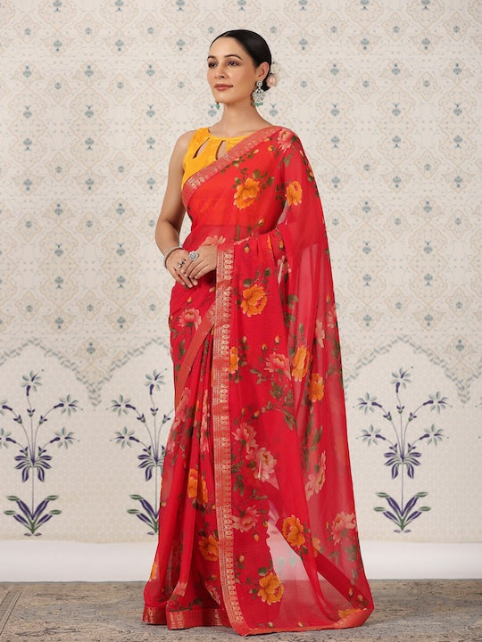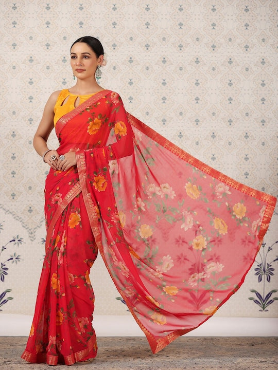 House of Pataudi Red & Yellow Floral Printed Zari Poly Georgette Saree