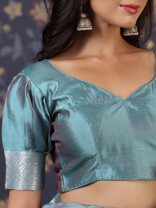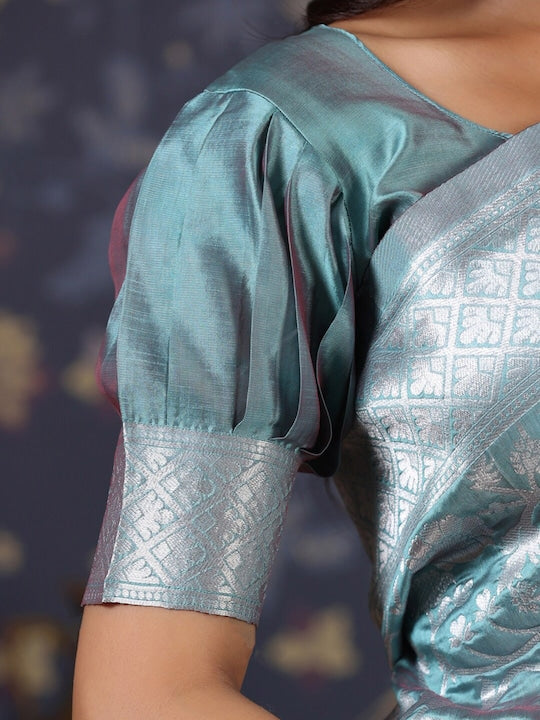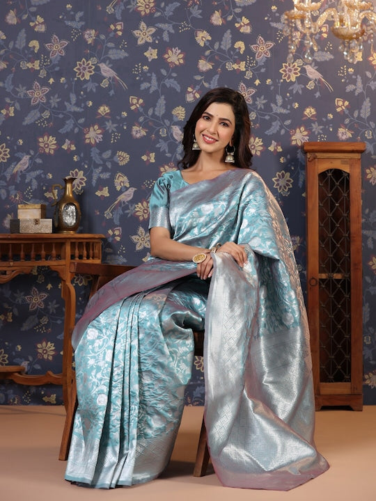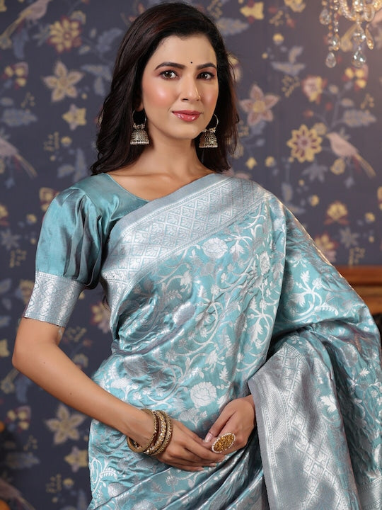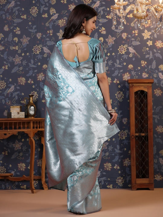 - Elevate your traditional attire with this exquisite teal saree featuring:Woven design saree with intricate woven design border and zari detailing for an elegant touch.The saree comes with an unstitched blouse piece. Refer to the image for the actual design of the blouse piece.