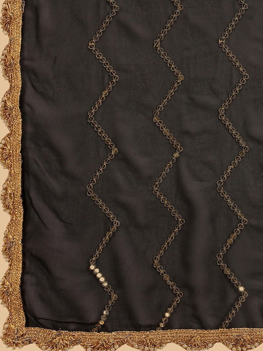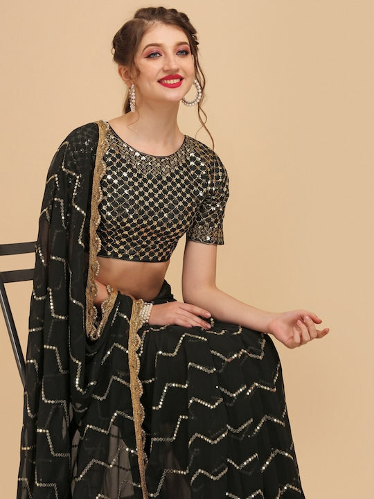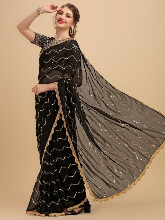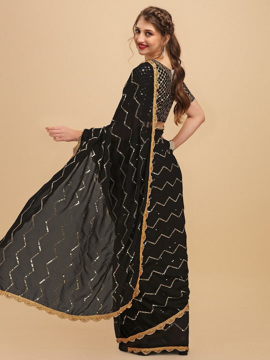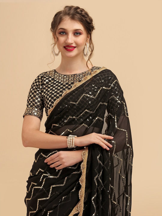 Sangria Black & Gold-Toned Embellished Sequinned Pure Georgette Saree