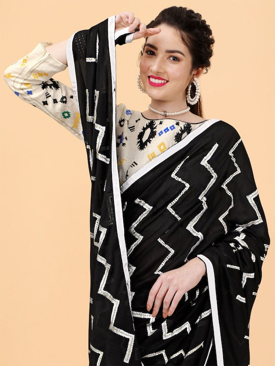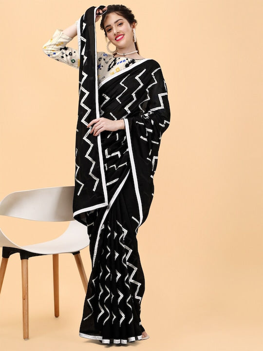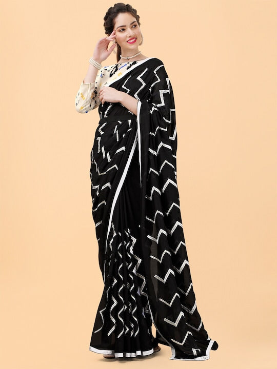 • Black and gold-toned saree with Leheriya embellishments and an embellished border.