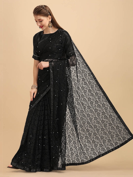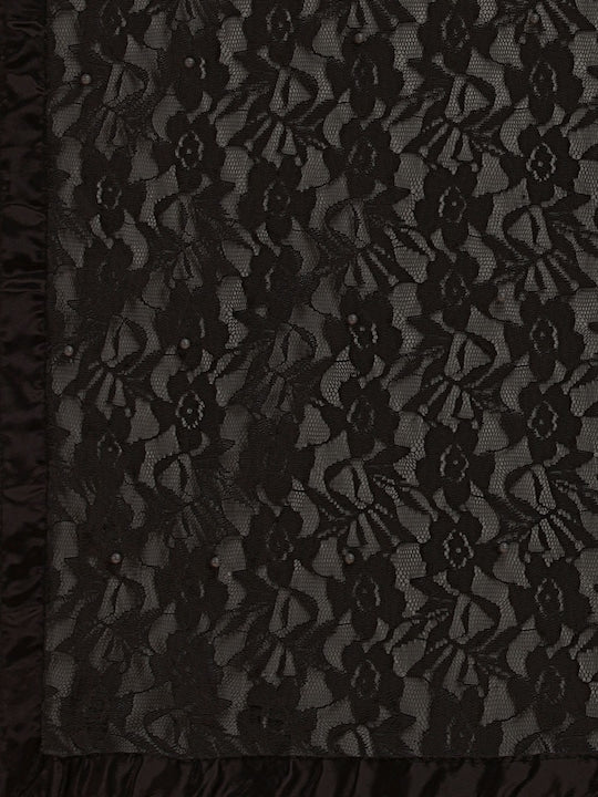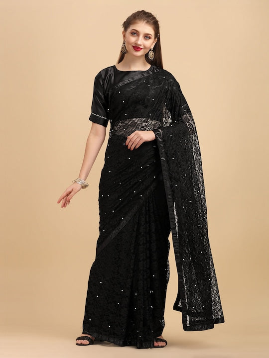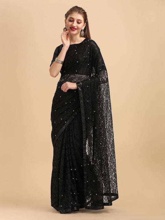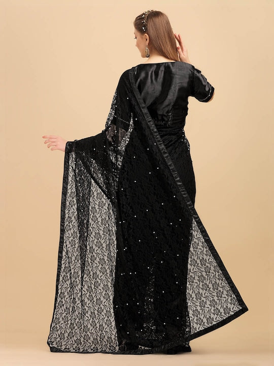 Sangria Black & White Floral Beads and Stones Lace Saree