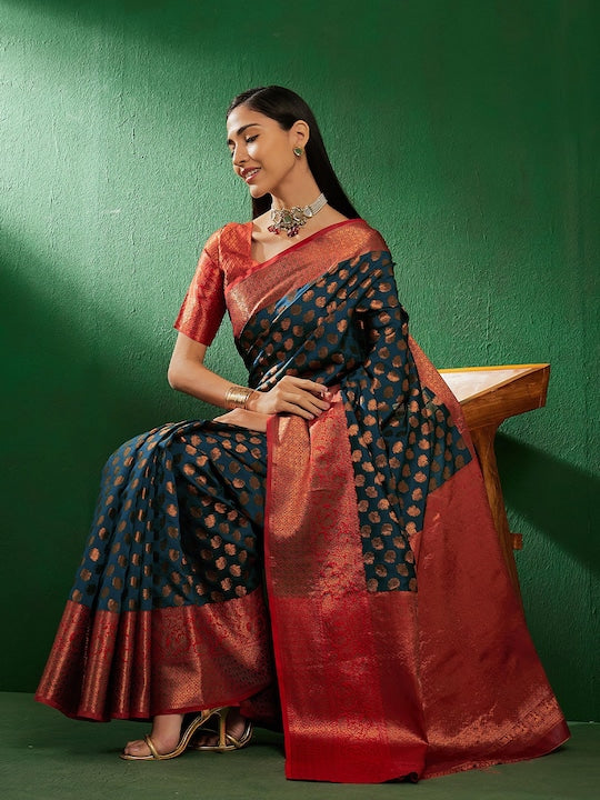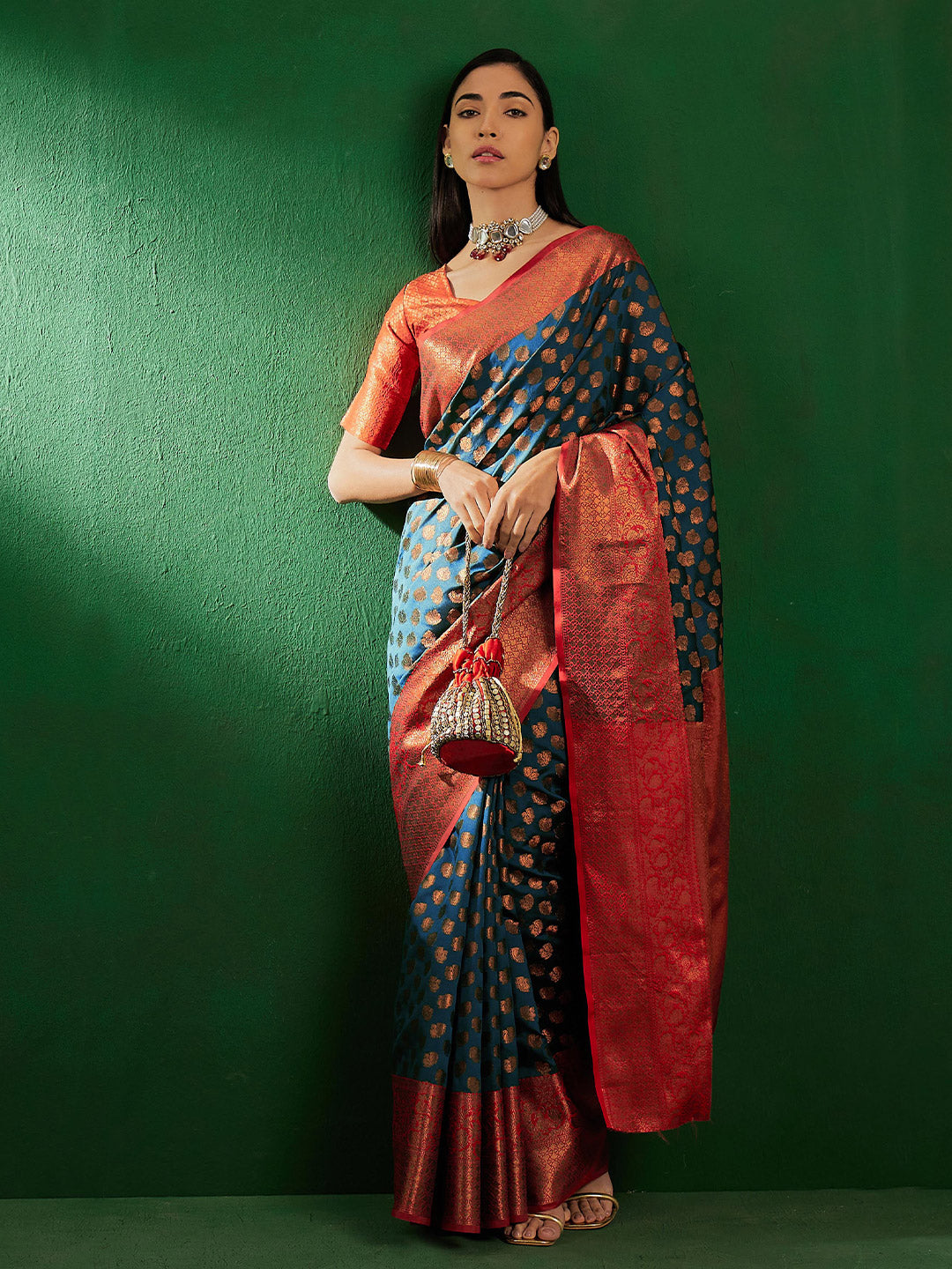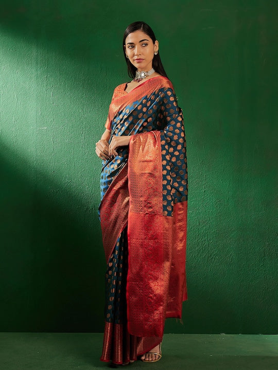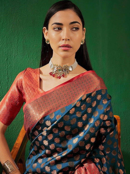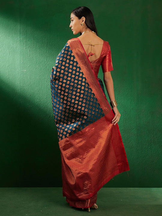 Sangria Blue & Gold Toned Woven Design Zari Banarasi Saree