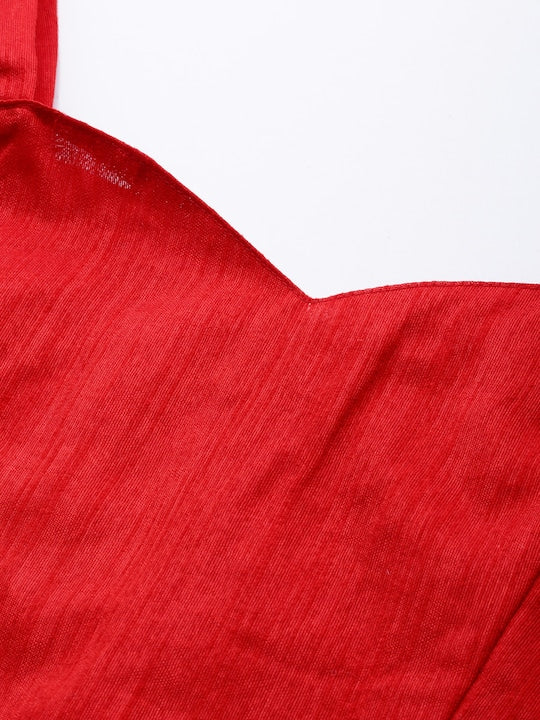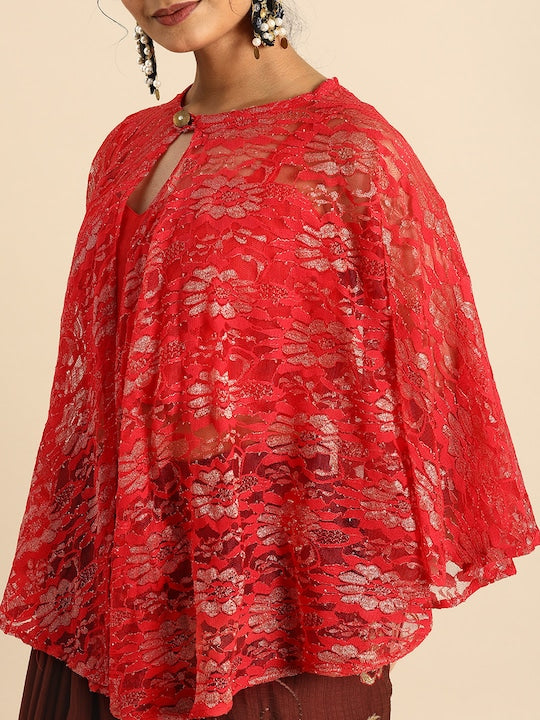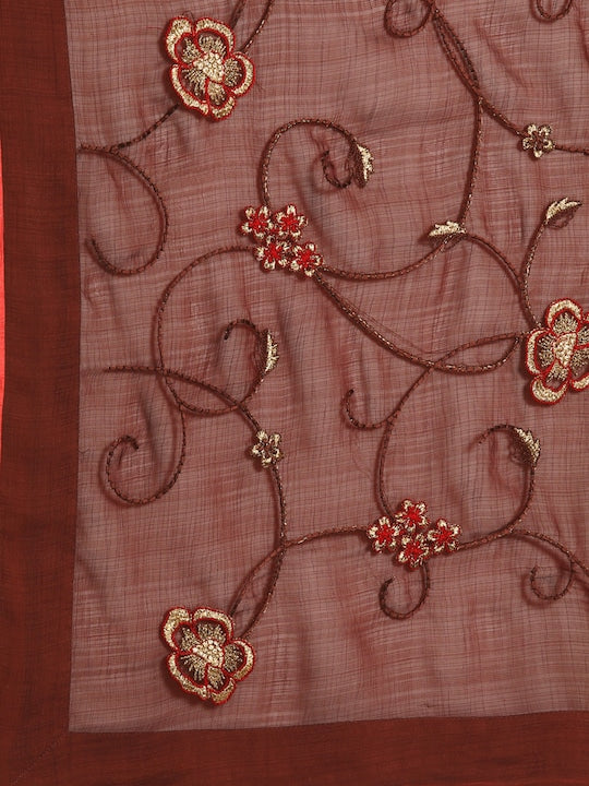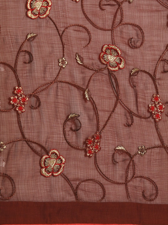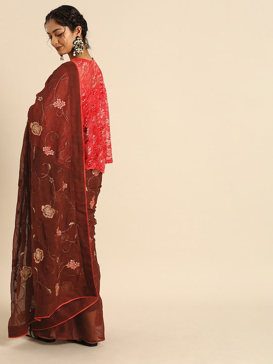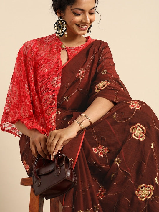 • Coffee Brown and Red embroidered saree with an embroidered border.