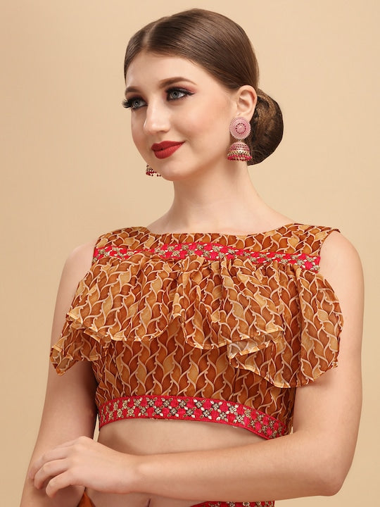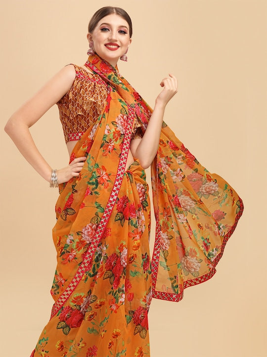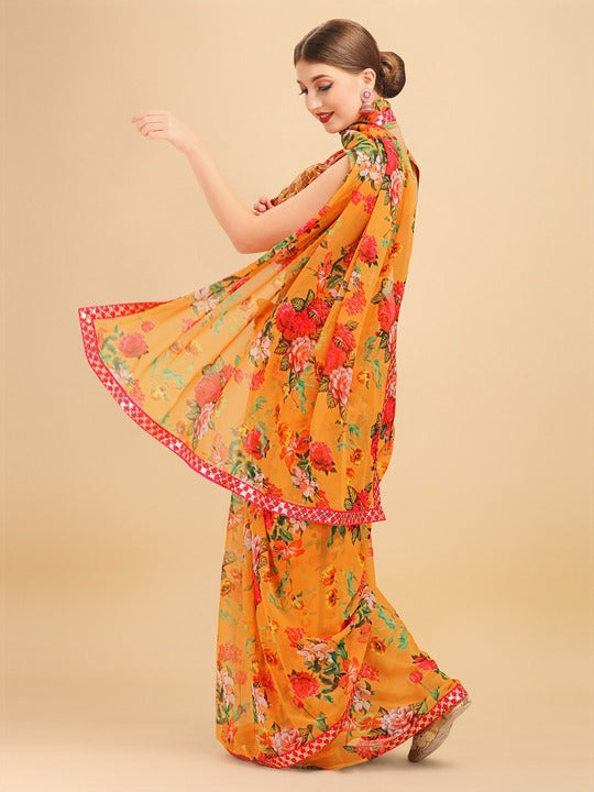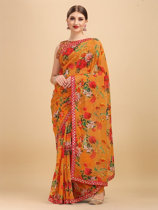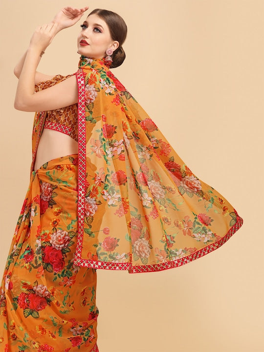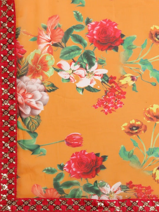 Sangria Mustard & Red Floral Sequinned Pure Georgette Saree