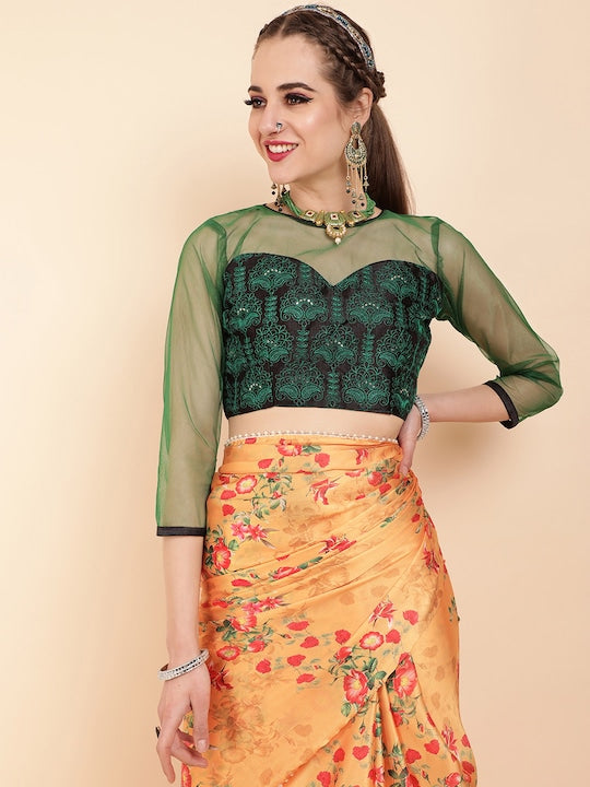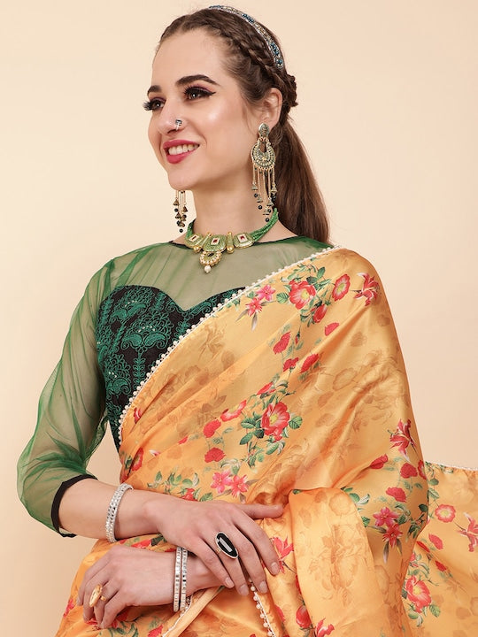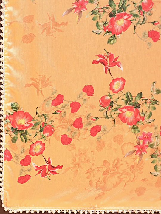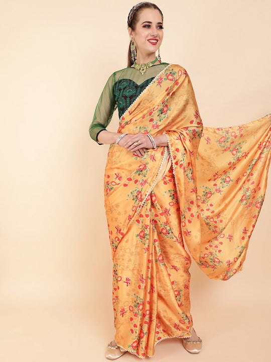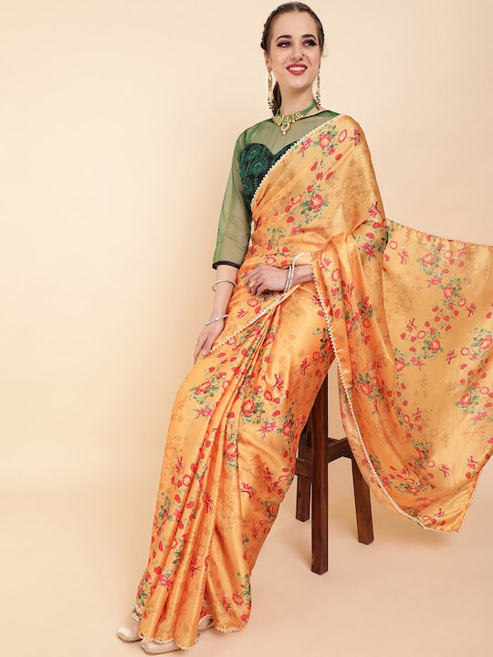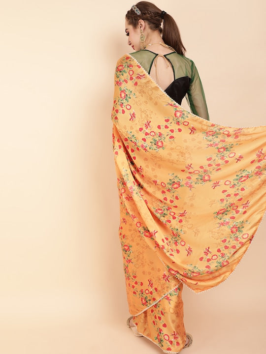 Sangria Mustard Yellow & Red Floral Satin Saree