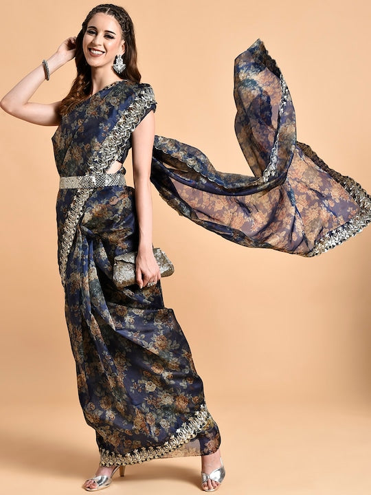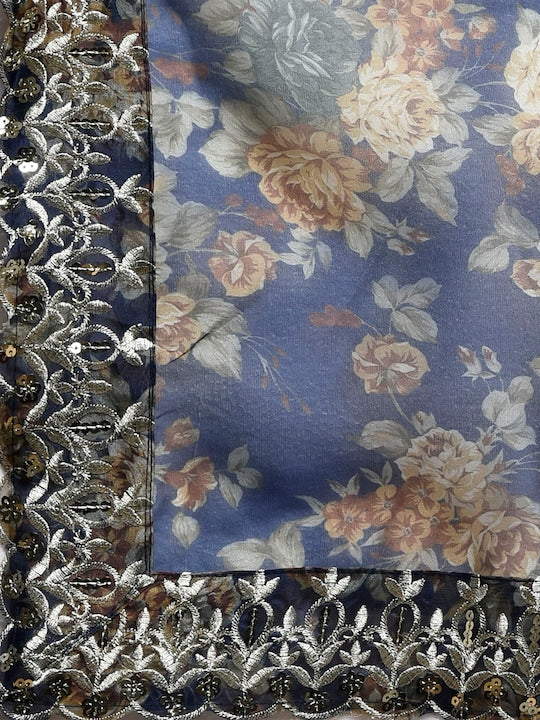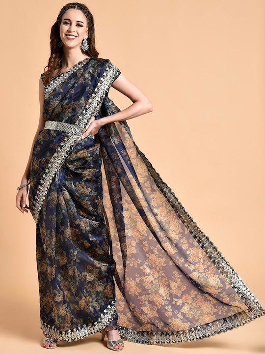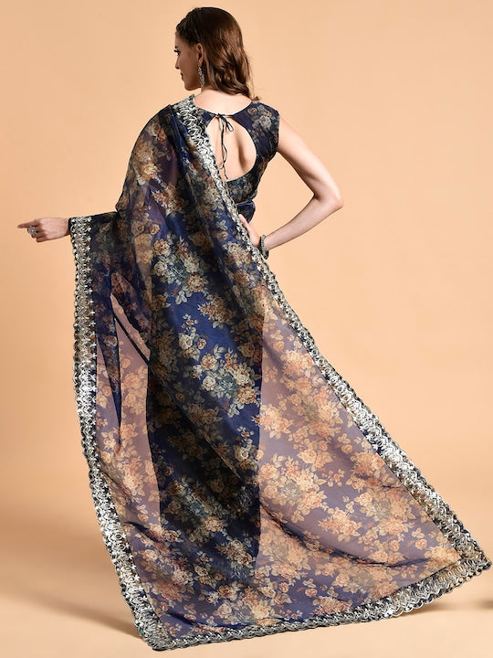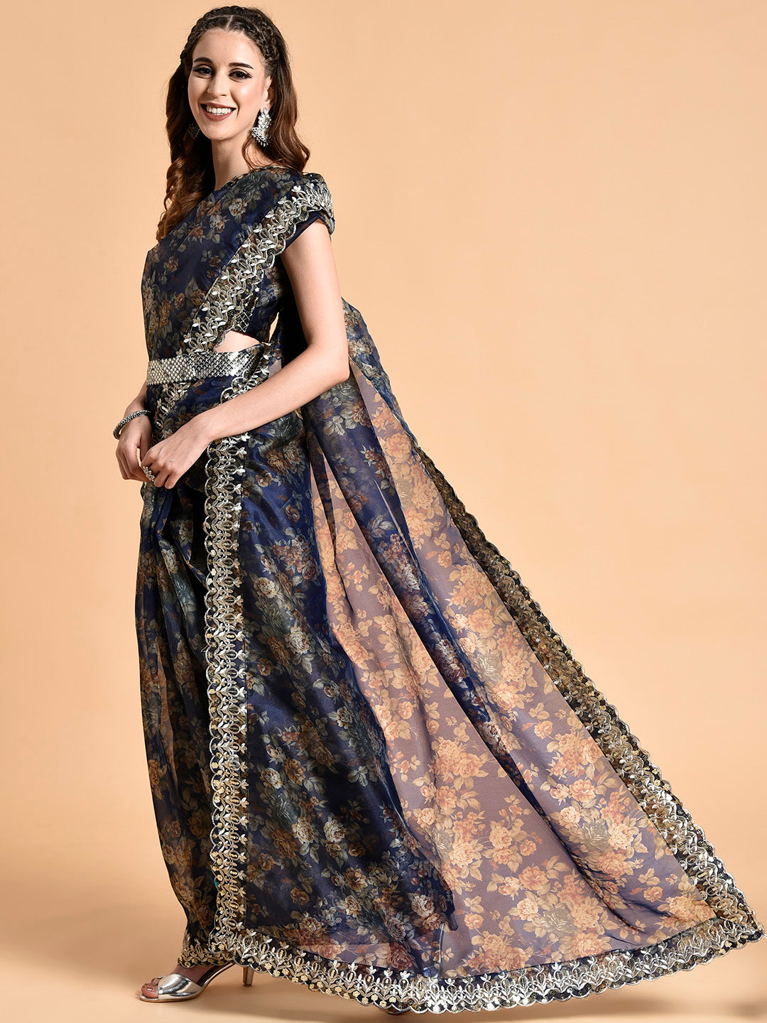 Sangria Navy Blue & Peach-Coloured Floral Sequinned Organza Saree