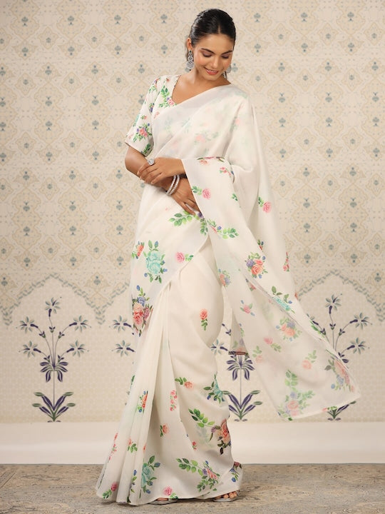 House of Pataudi Pure Georgette Floral Printed Sequinned Saree