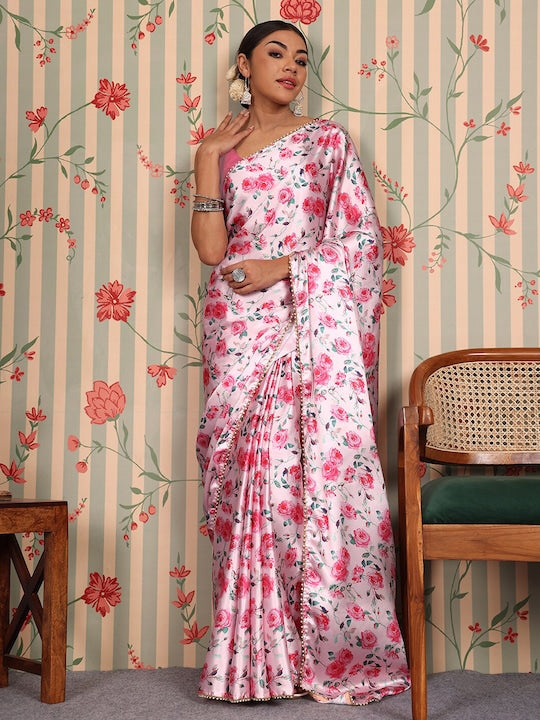 House of Pataudi Floral Printed Sequinned Organza Saree