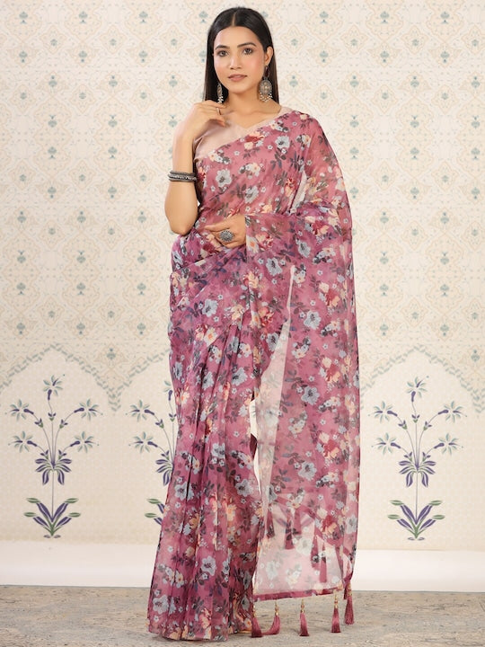House of Pataudi Mauve & White Floral Printed Organza Saree