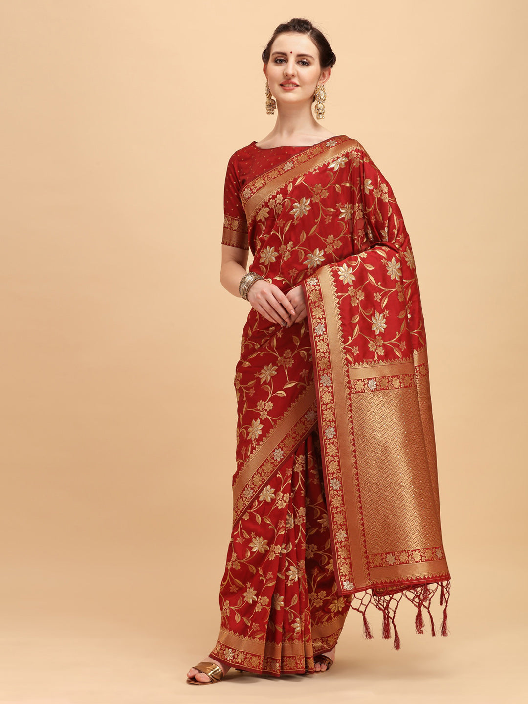 House of Pataudi Red & Golden Floral Zari Silk Blend Saree