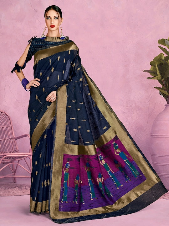 Sangria Navy Blue Ethnic Woven-Designed Festive Saree With Blouse Piece