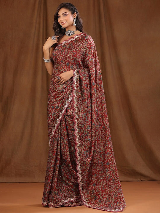 Sangria Maroon Floral Printed Beads And Stones Sarees