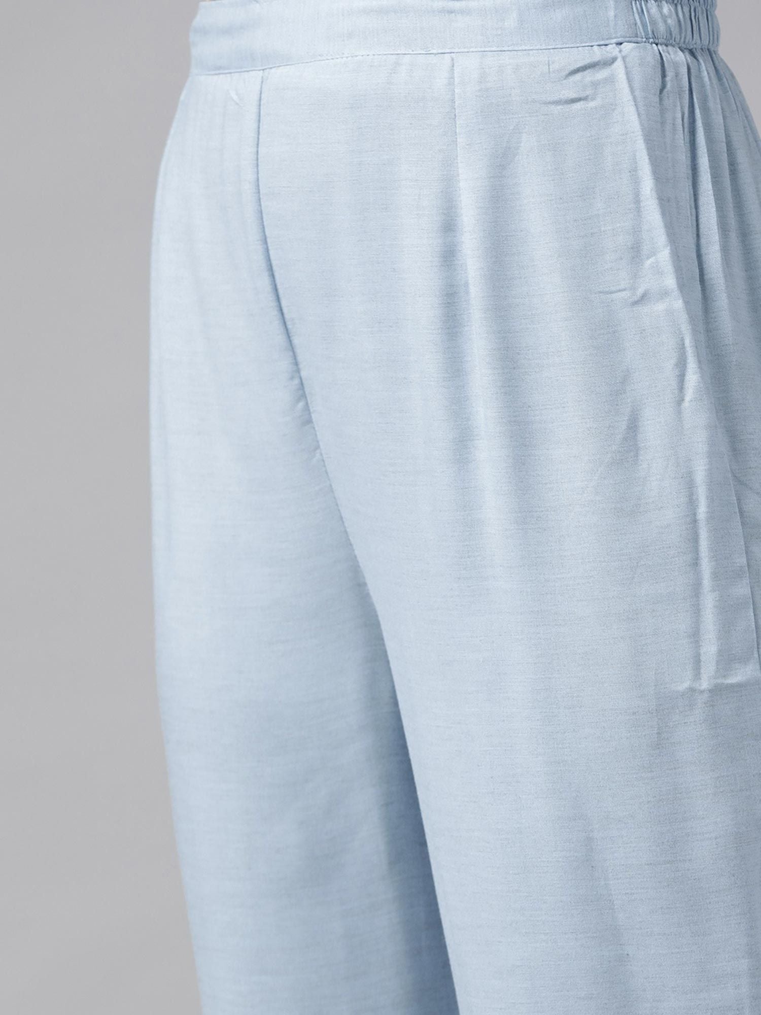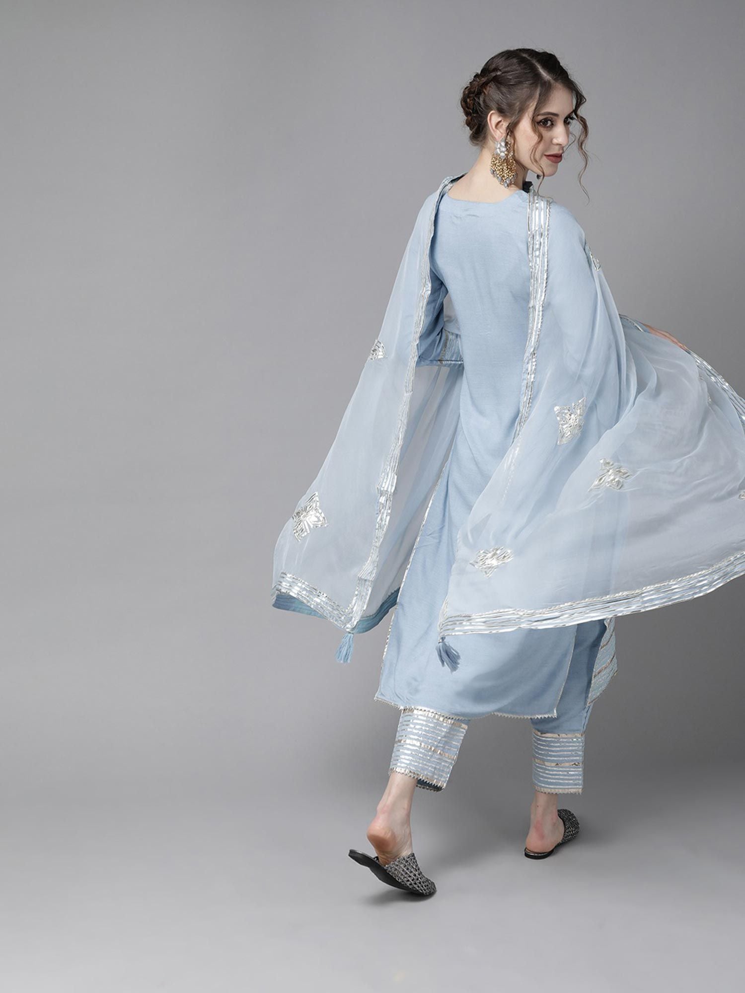 - The set features an Embroidered A-Line Calf Length Kurta with a Tie-Up Neckline, Three-Quarter Regular Sleeves, Straight Hem, and Side Slits. Paired with a Blue Trouser adorned with Gota Patti embroidery, elasticated with a slip-on closure, and a Blue Chiffon Dupatta with Tassels and Gota Patti Work, this ensemble is a perfect blend of style and tradition.