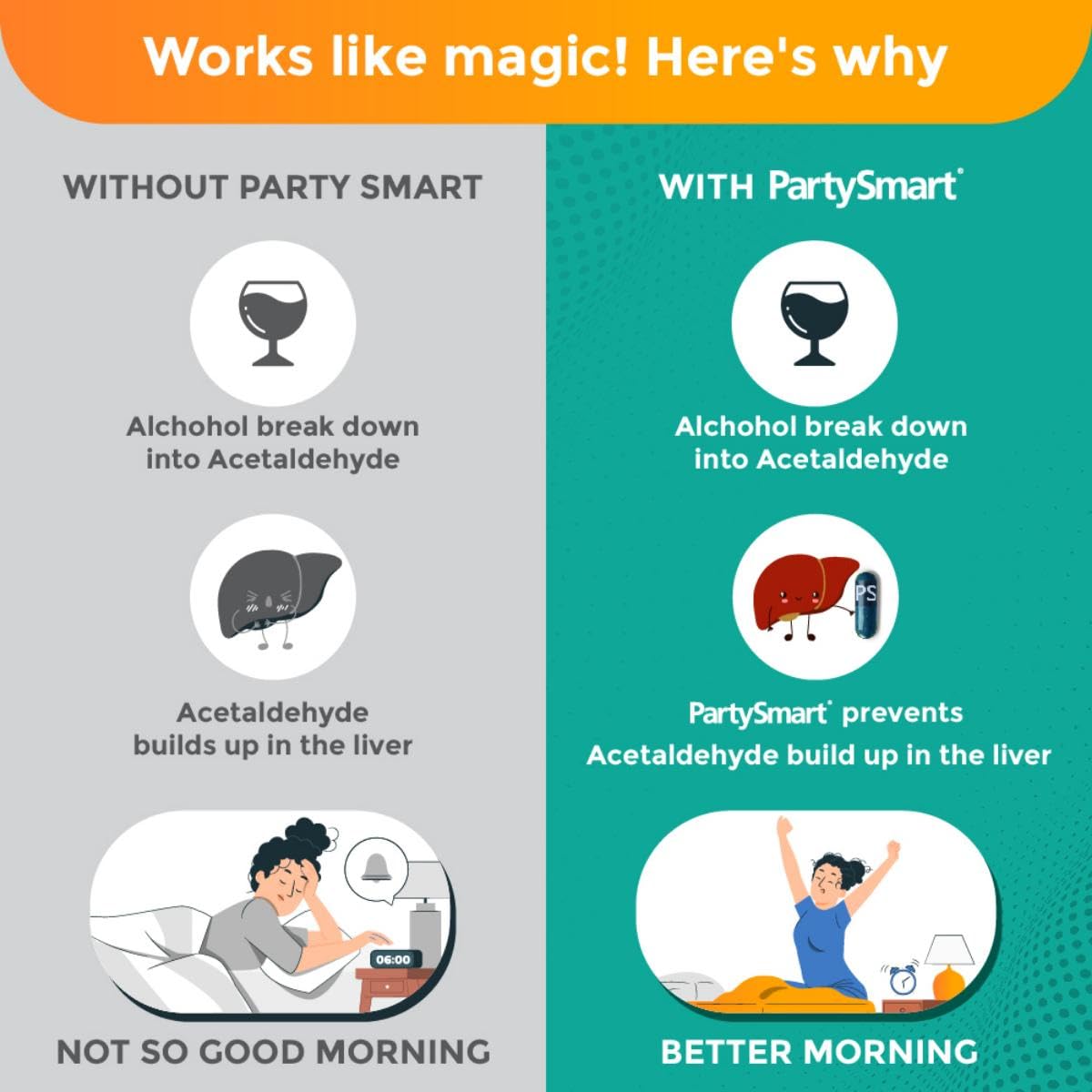 - PartySmart prevents the adverse effects of alcohol by rapidly eliminating acetaldehyde from blood.